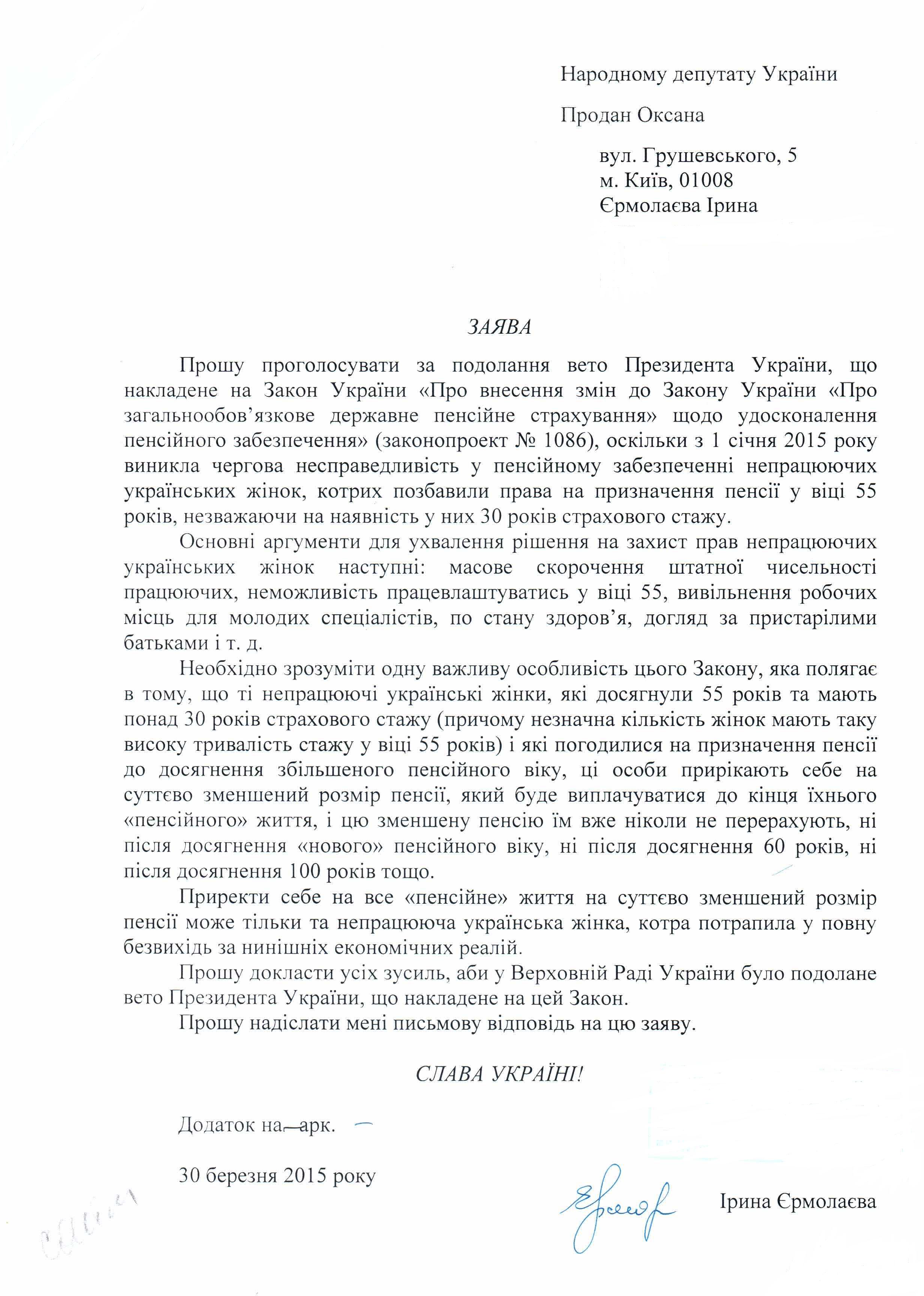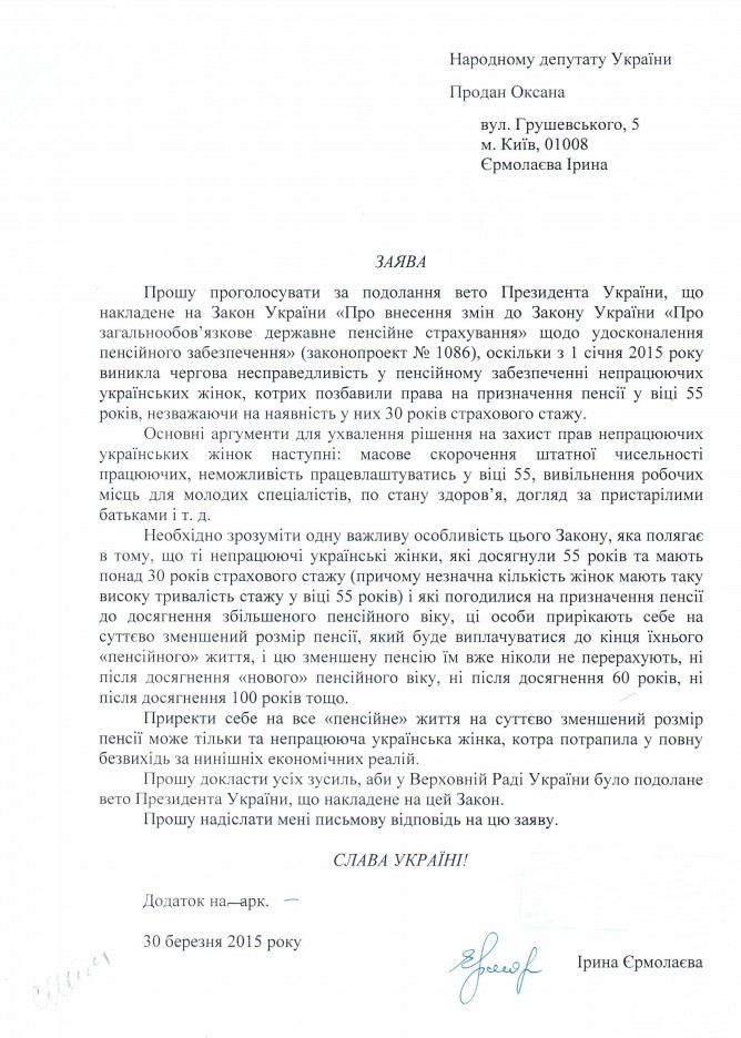 Вхідна документація > Звернення І.Єрмолаєва щодо подолання вето Президента по законопроекту “Про внесення змін до Закону України “Про загальнообов’язкове державне пенсійне страхування” щодо удосконалення пенсійного забезпечення, реєстр. №1086