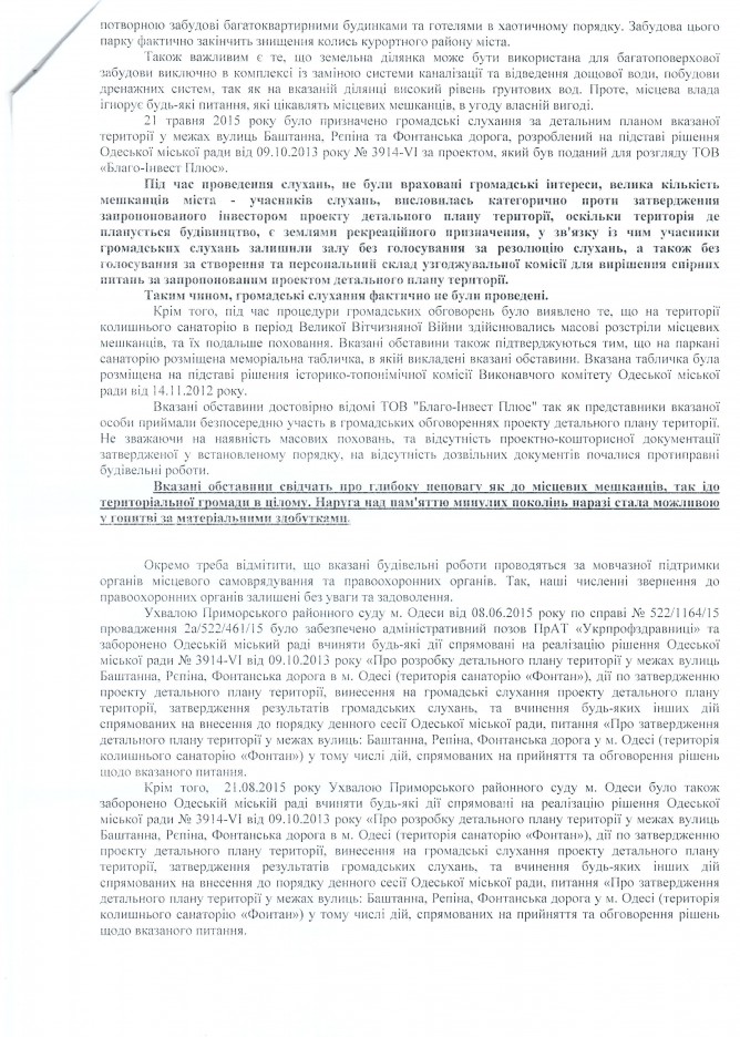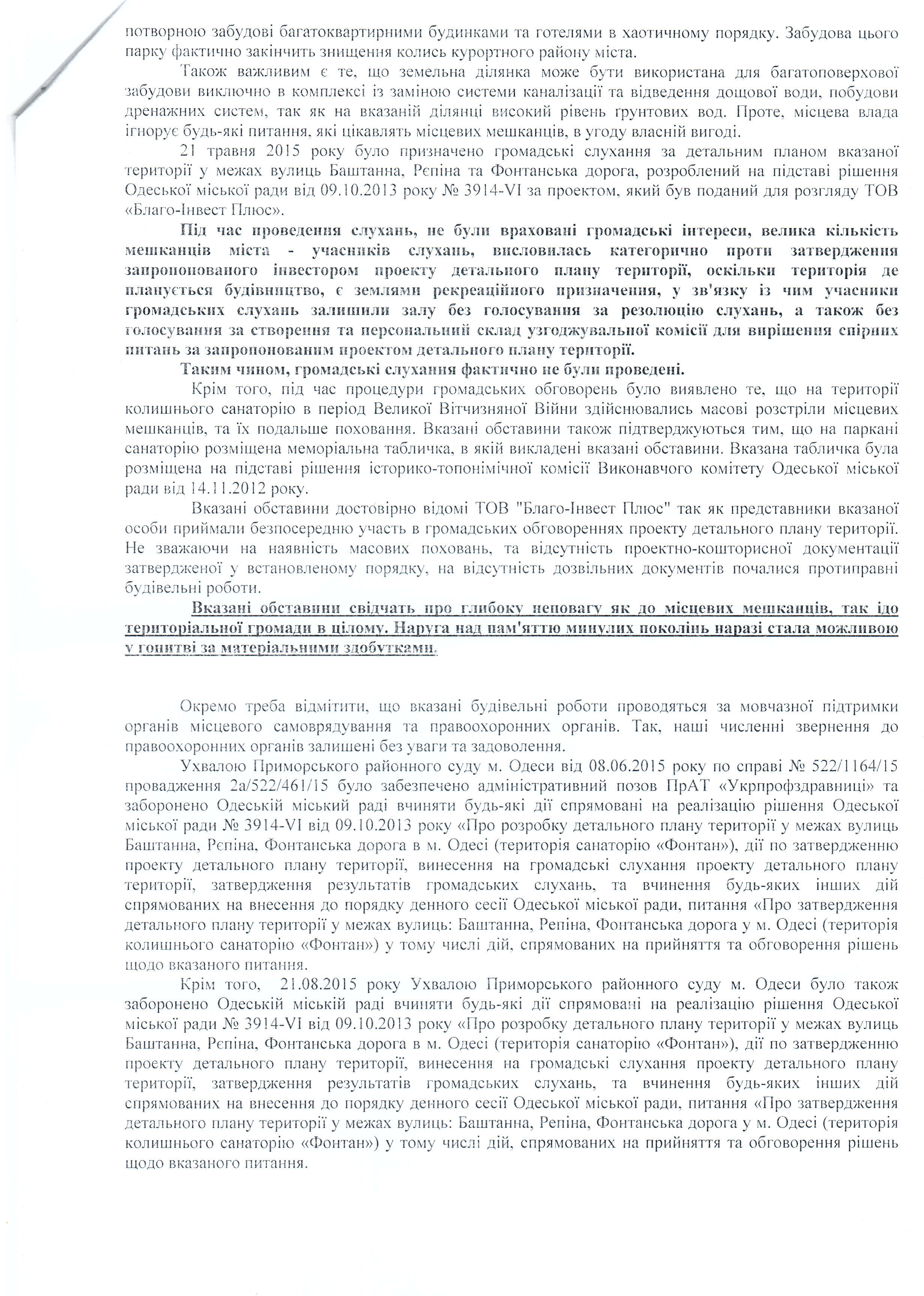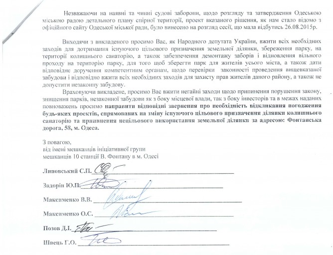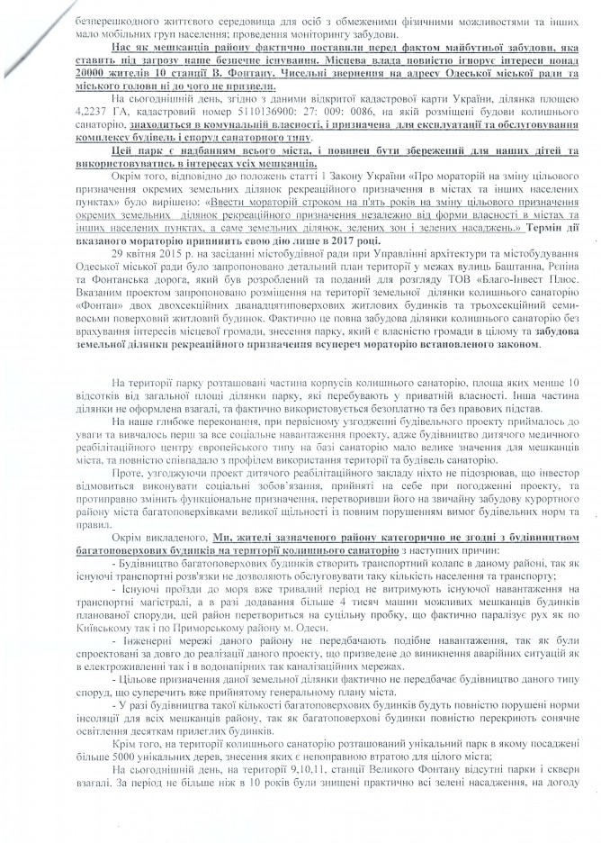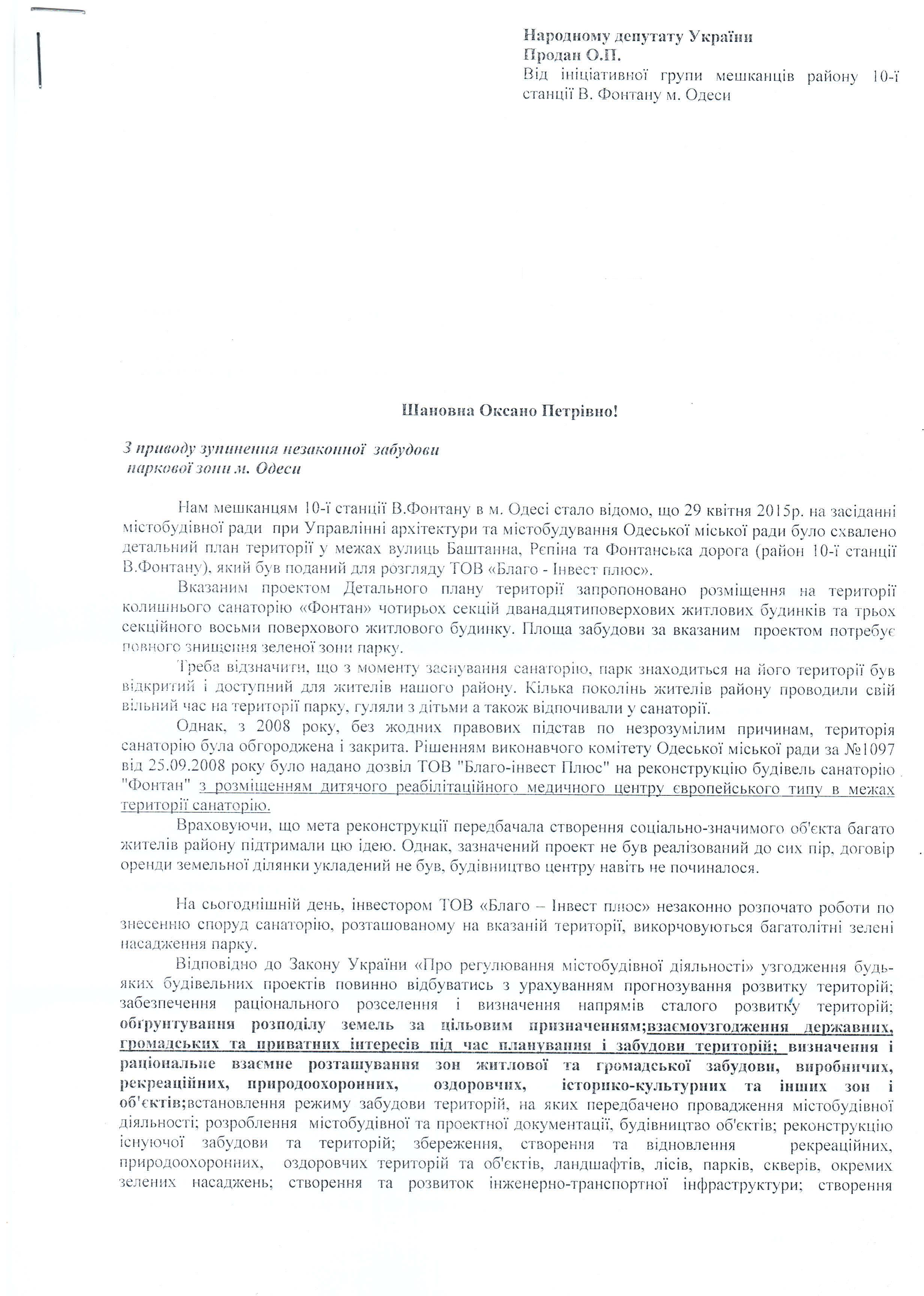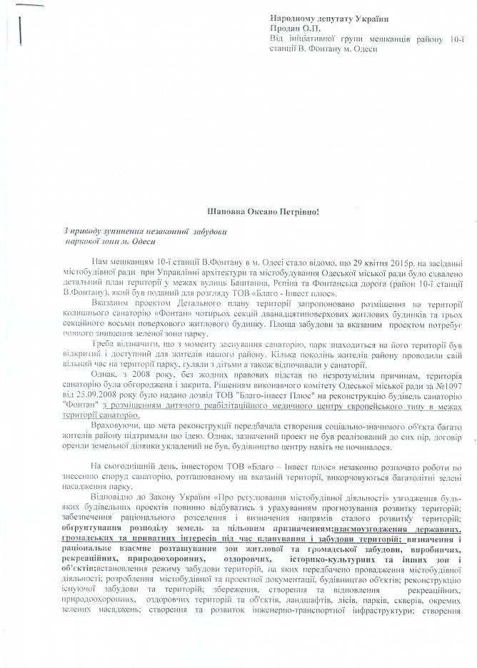 09Лис Коментування вимкнено Звернення Ініціативної групи мешканців району 10-ї станції В.Фонтну м. Одеси щодо збереження рекреаційної зони на території санаторію “Фонтан” ДЕПУТАТСЬКЕ ЗВЕРНЕННЯ ДОРУЧЕННЯ ВІЦЕ-ПРЕМ’ЄР-МІНІСТРА Г.ЗУБКА ВІДПОВІДЬ МІНРЕГІОНУ ВІДПОВІДЬ ОДЕСЬКОГО МІСЬКОГО ГОЛОВИ