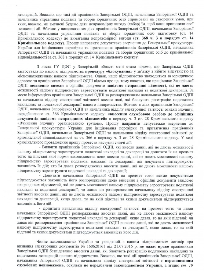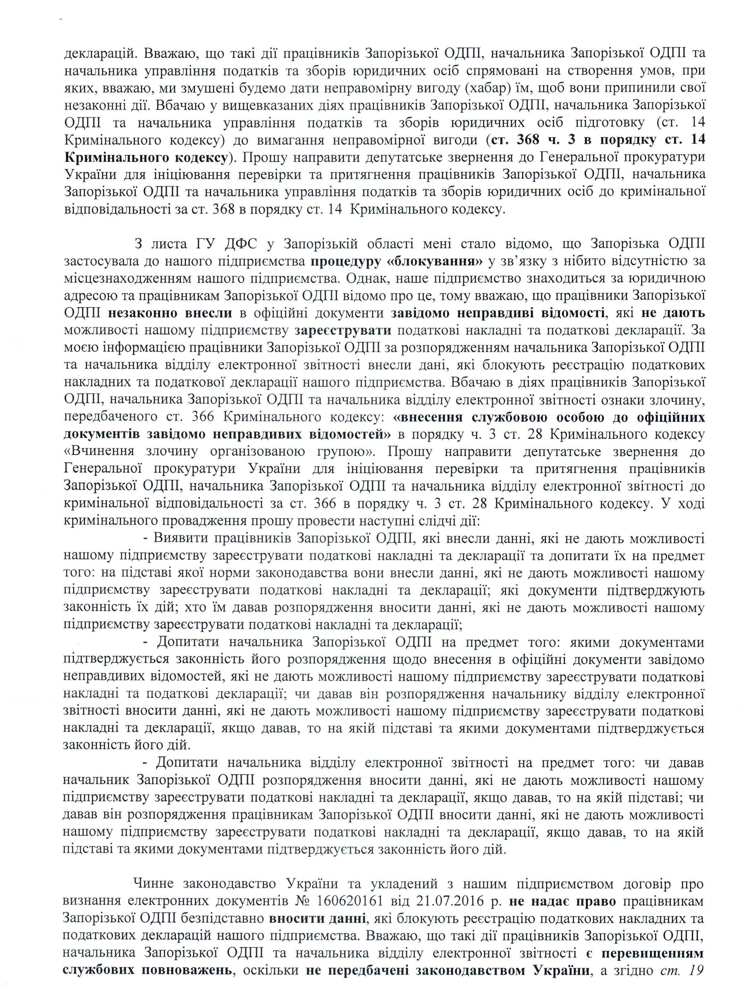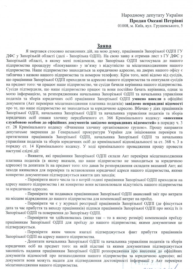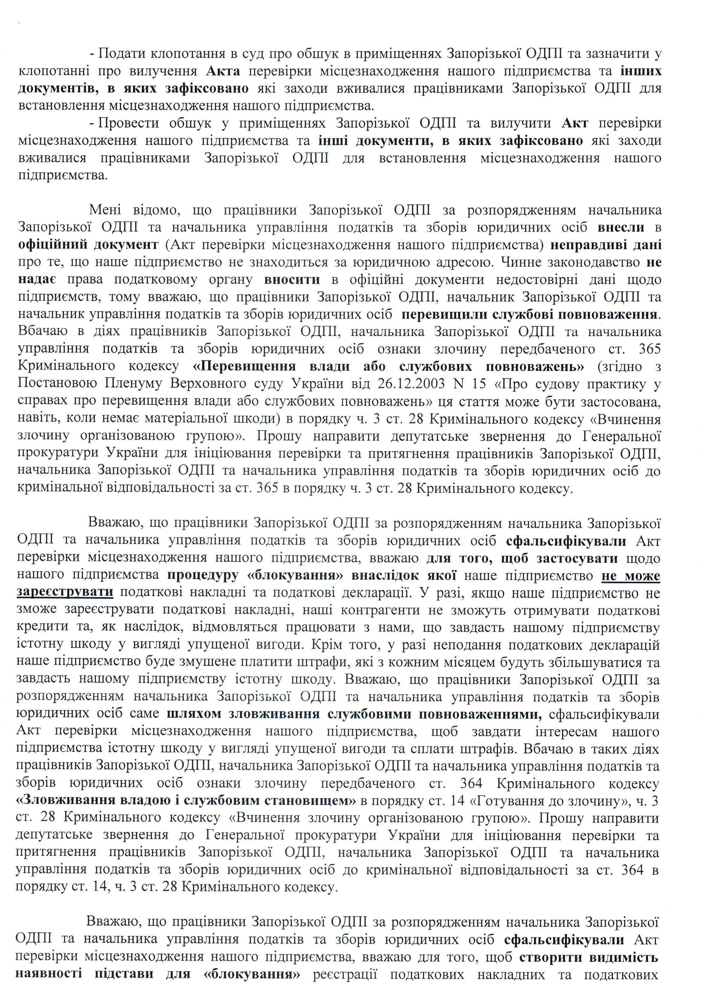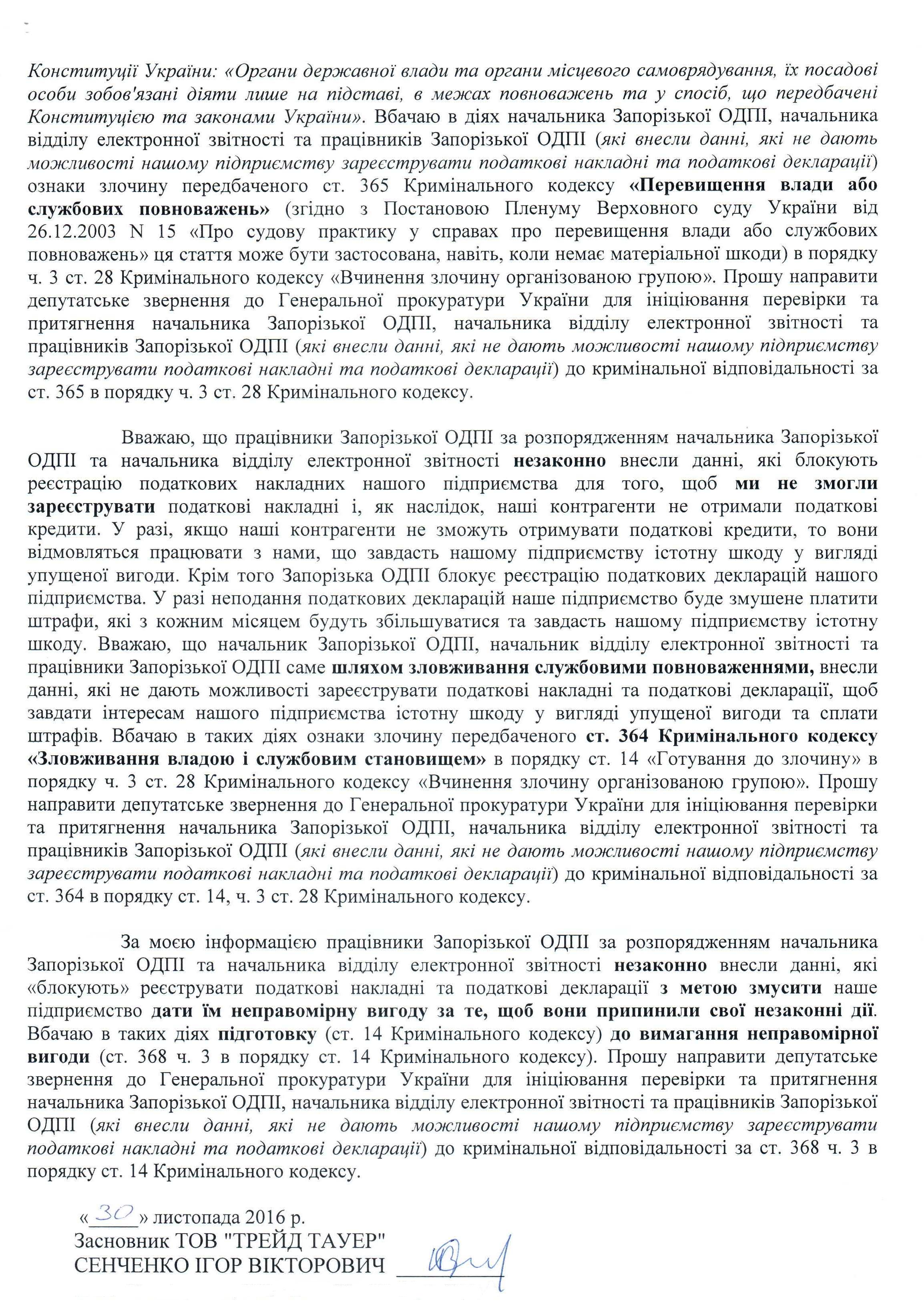 Головна > Верховна Рада України > Вхідна документація > Звернення керівника ТОВ «Трейд Тауер» І.В. Сенченка щодо порушення законодавства співробітниками Запорізької ОДПІ ГУ ДФС в Запорізькій області