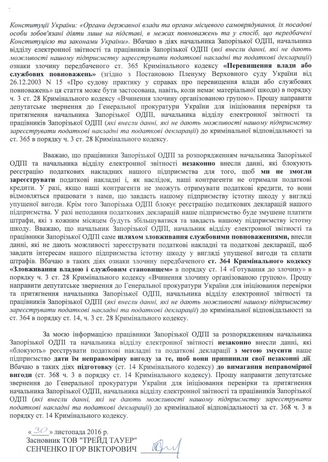 Звернення керівника ТОВ «Трейд Тауер» І.В. Сенченка щодо порушення законодавства співробітниками Запорізької ОДПІ ГУ ДФС в Запорізькій області