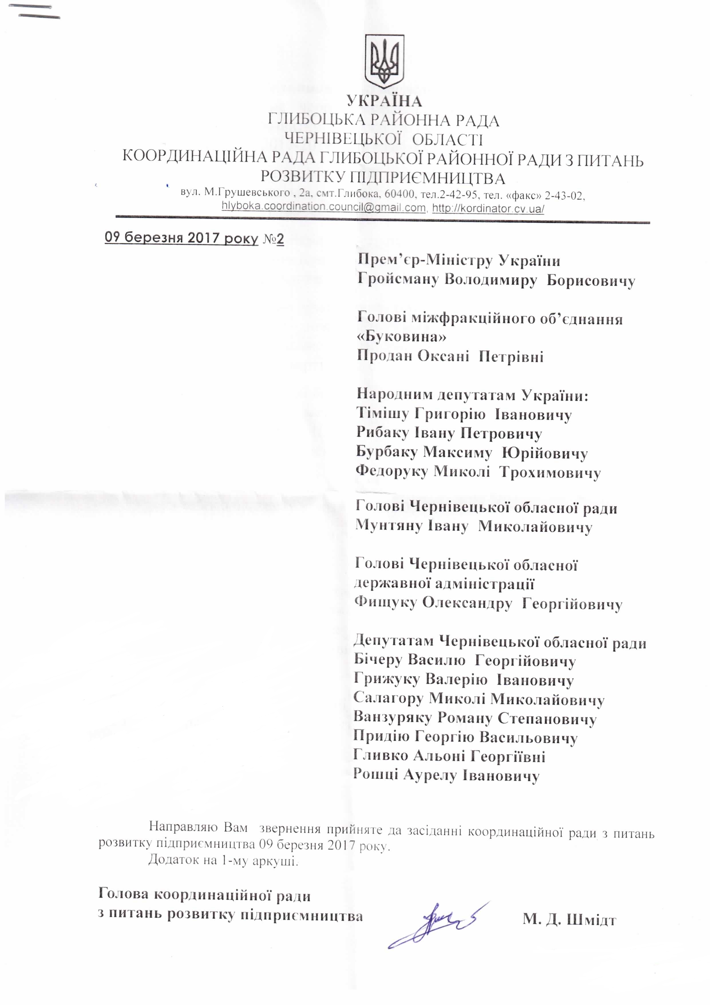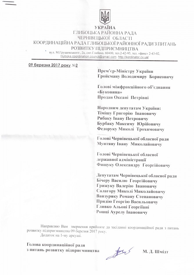 Головна > Верховна Рада України > Вхідна документація > Звернення Координаційної ради Глибоцької районної ради з питань розвитку підприємництва щодо сприяння у співфінансуванні Програми розвитку МСБ у Глибоцькому районі на 2017 – 2018 роки