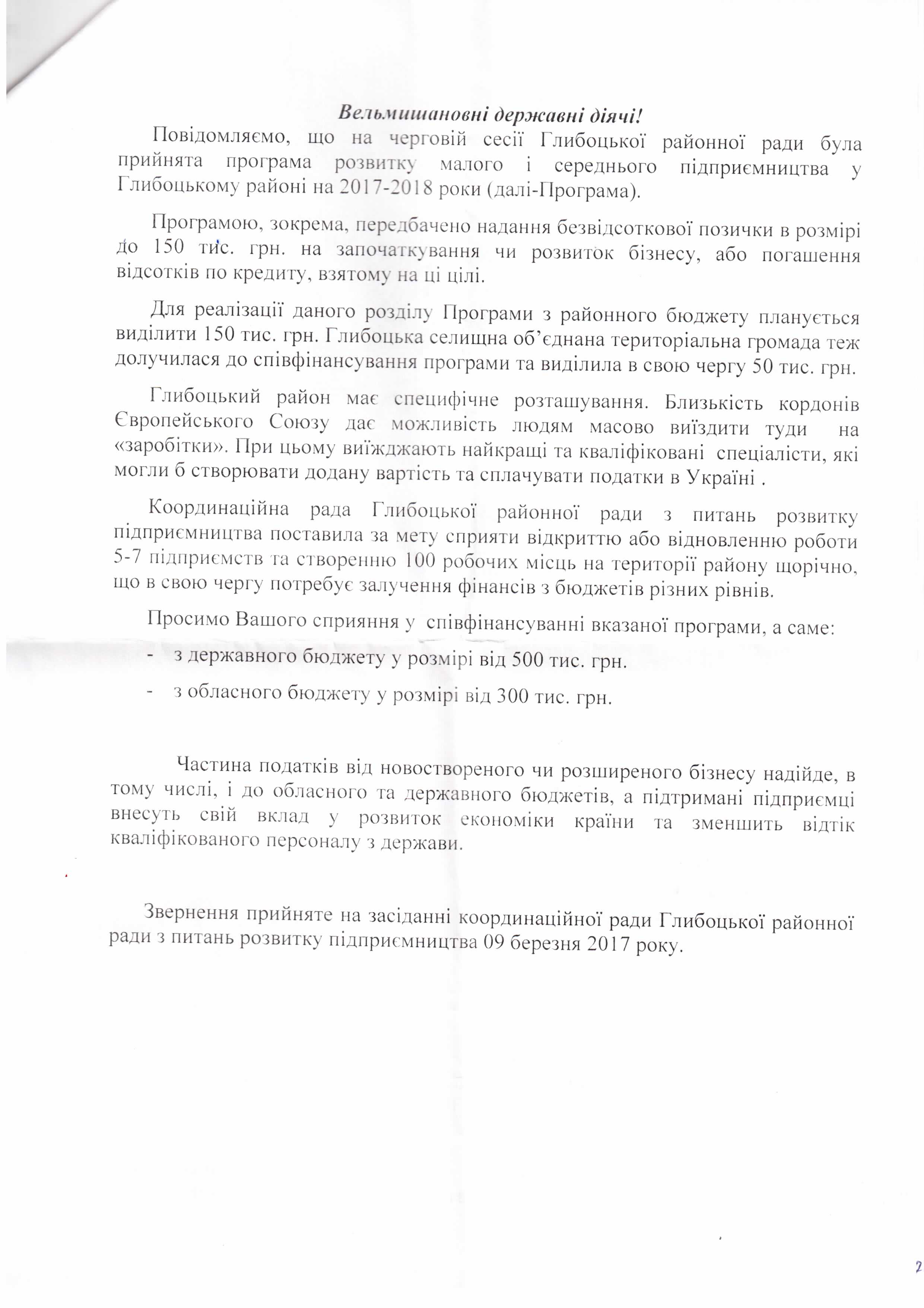 Звернення Координаційної ради Глибоцької районної ради з питань розвитку підприємництва щодо сприяння у співфінансуванні Програми розвитку МСБ у Глибоцькому районі на 2017 – 2018 роки