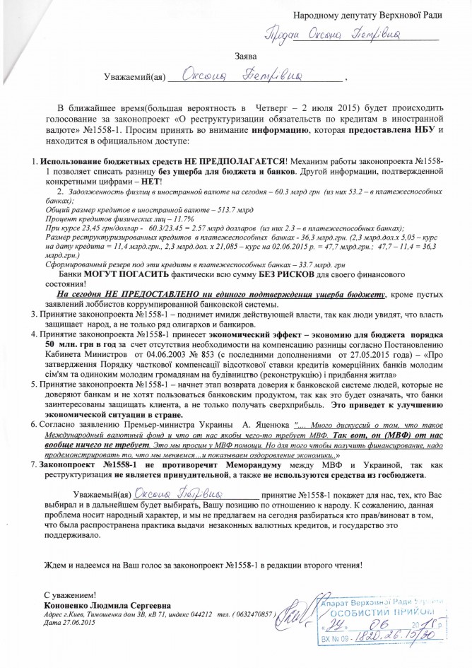 13Лип Коментування вимкнено Звернення Л.С. Кононенко щодо підтримки законопроекту “Про реструктуризацію зобов’язань за кредитами в іноземній валюті”, реєстр. №1558-1