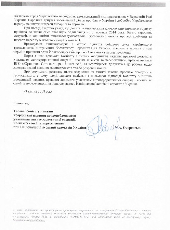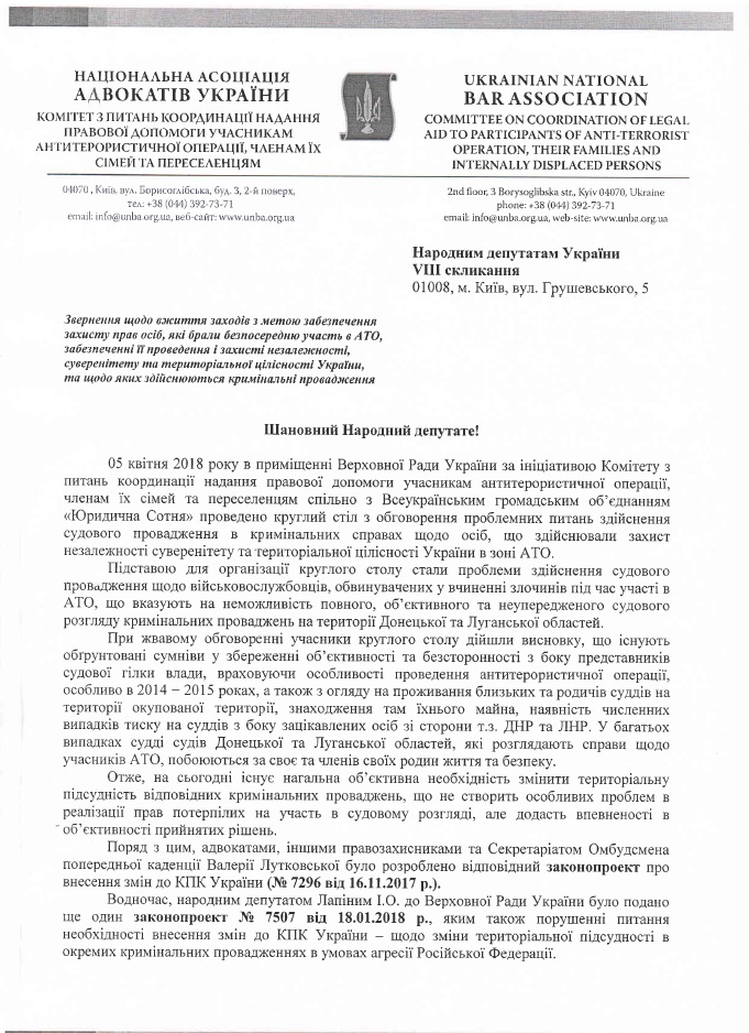 Головна > Верховна Рада України > Вхідна документація > Звернення Національної асоціації адвокатів України щодо вжиття заходів з метою забезпечення захисту прав осіб, які брали безпосередню участь в АТО, щодо яких є кримінальні провадження