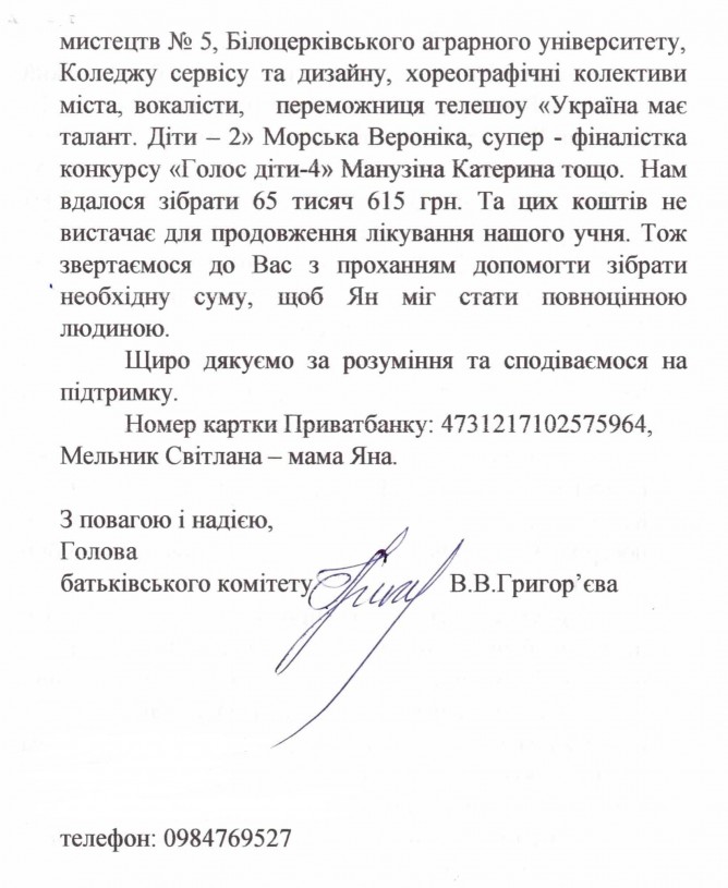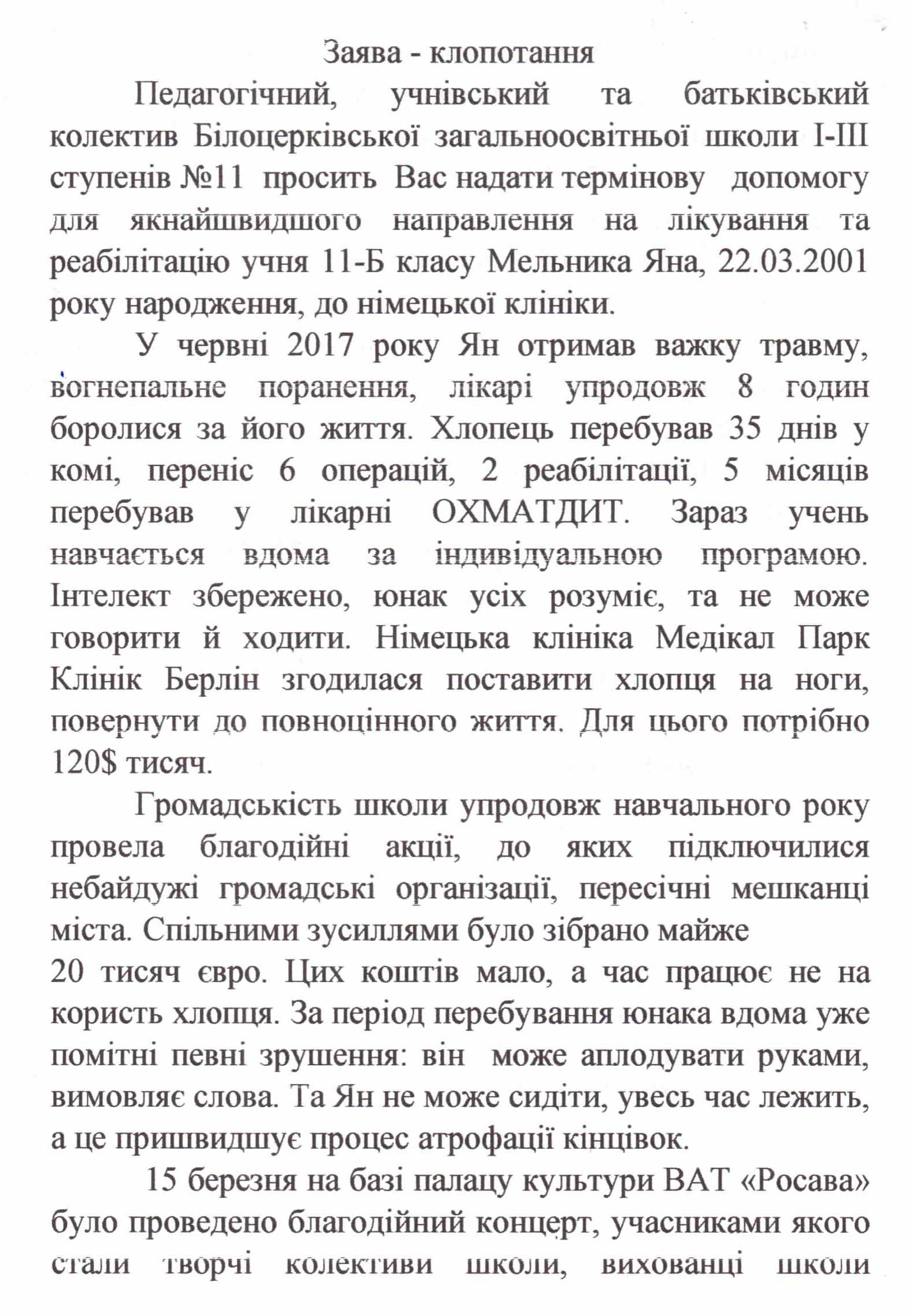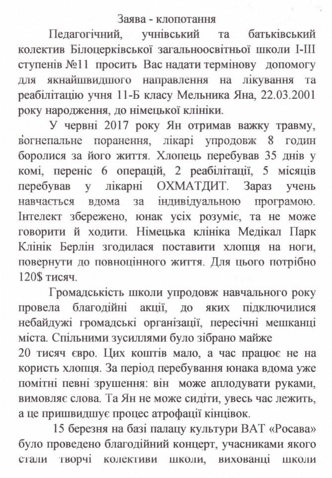 25Тра Коментування вимкнено Звернення педагогічного, учнівського та батьківського колективів Білоцерківської загальноосвітньої школи №11 щодо надання допомоги на лікування та реабілітацію учениці 11-го класу Мельник Яни