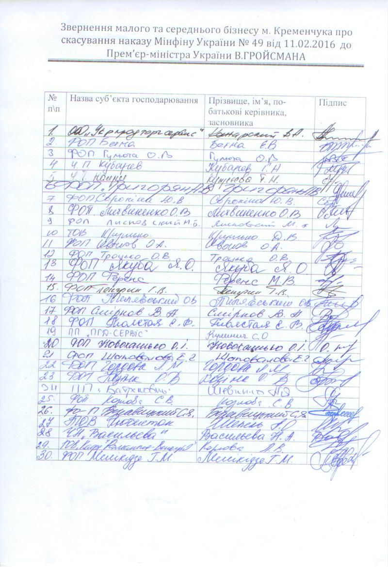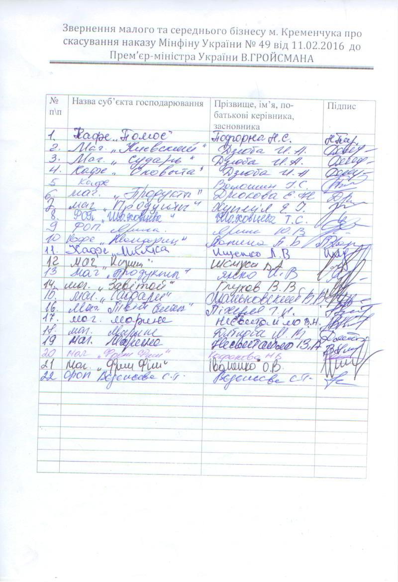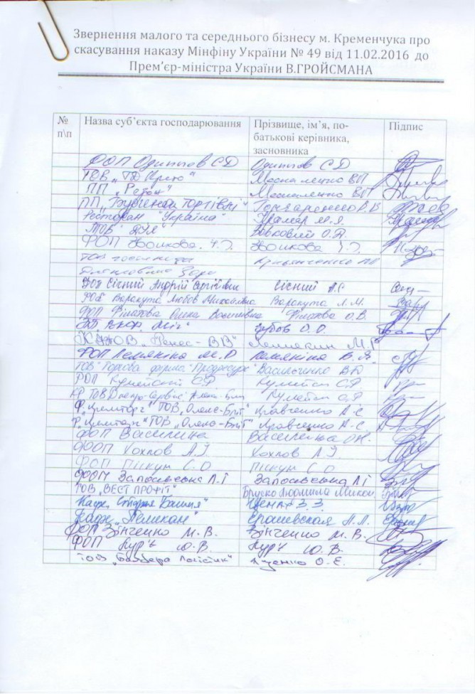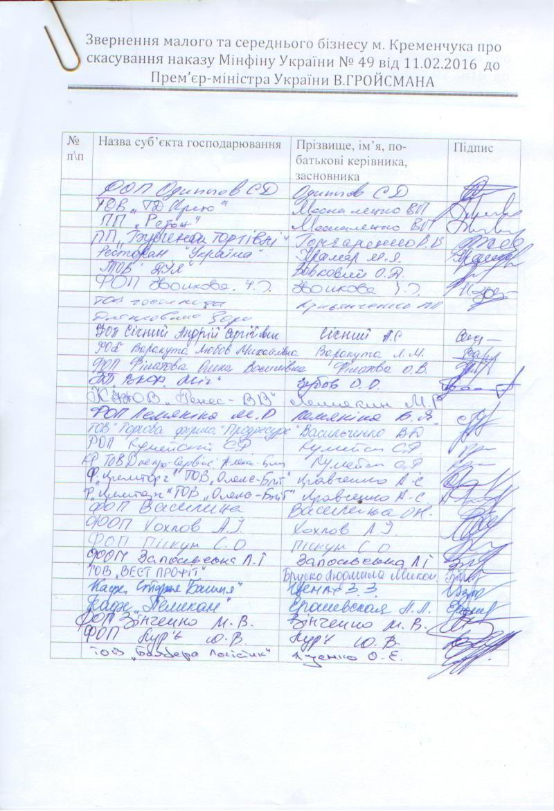 підприємців міста Кременчука до Кабінету Міністрів України про скасування окремих додатків до наказу Міністерства фінансів України від 11.02.2016 № 49 «Про затвердження форм звітів щодо виробництва й обігу спирту, алкогольних напоїв і тютюнових виробів та порядків їх заповнення»