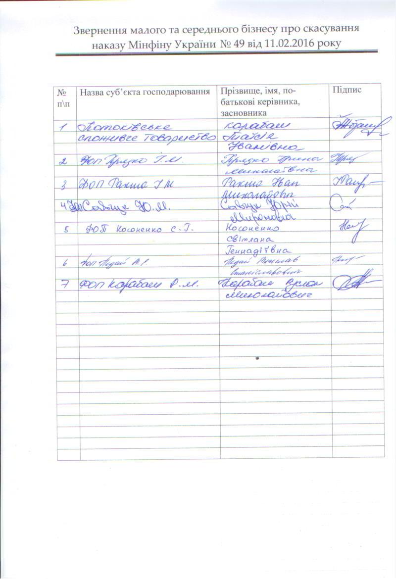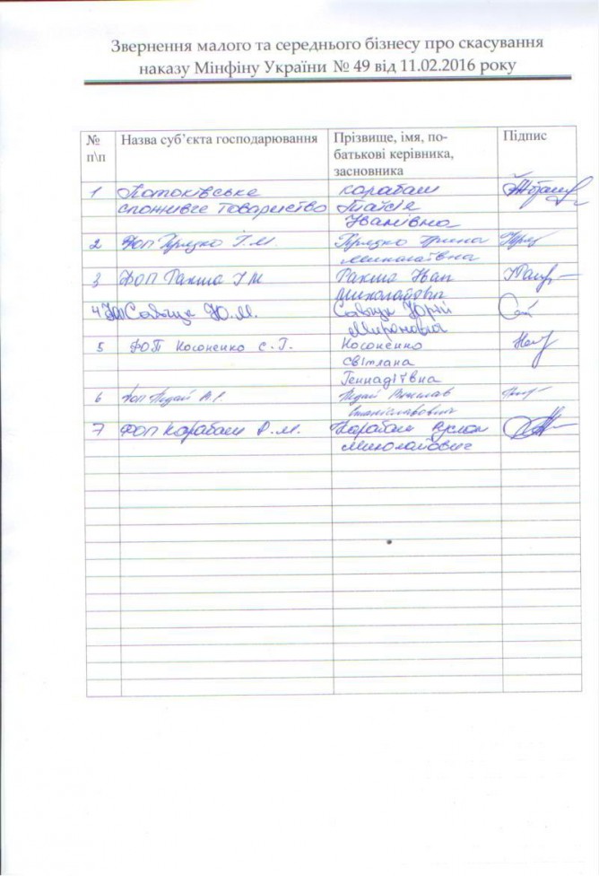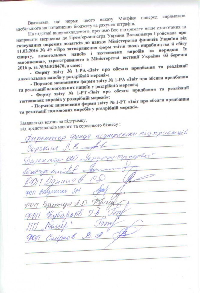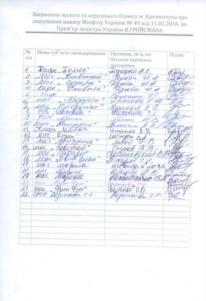 підприємців міста Кременчука до Кабінету Міністрів України про скасування окремих додатків до наказу Міністерства фінансів України від 11.02.2016 № 49 «Про затвердження форм звітів щодо виробництва й обігу спирту, алкогольних напоїв і тютюнових виробів та порядків їх заповнення»