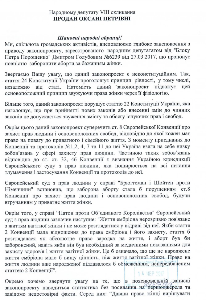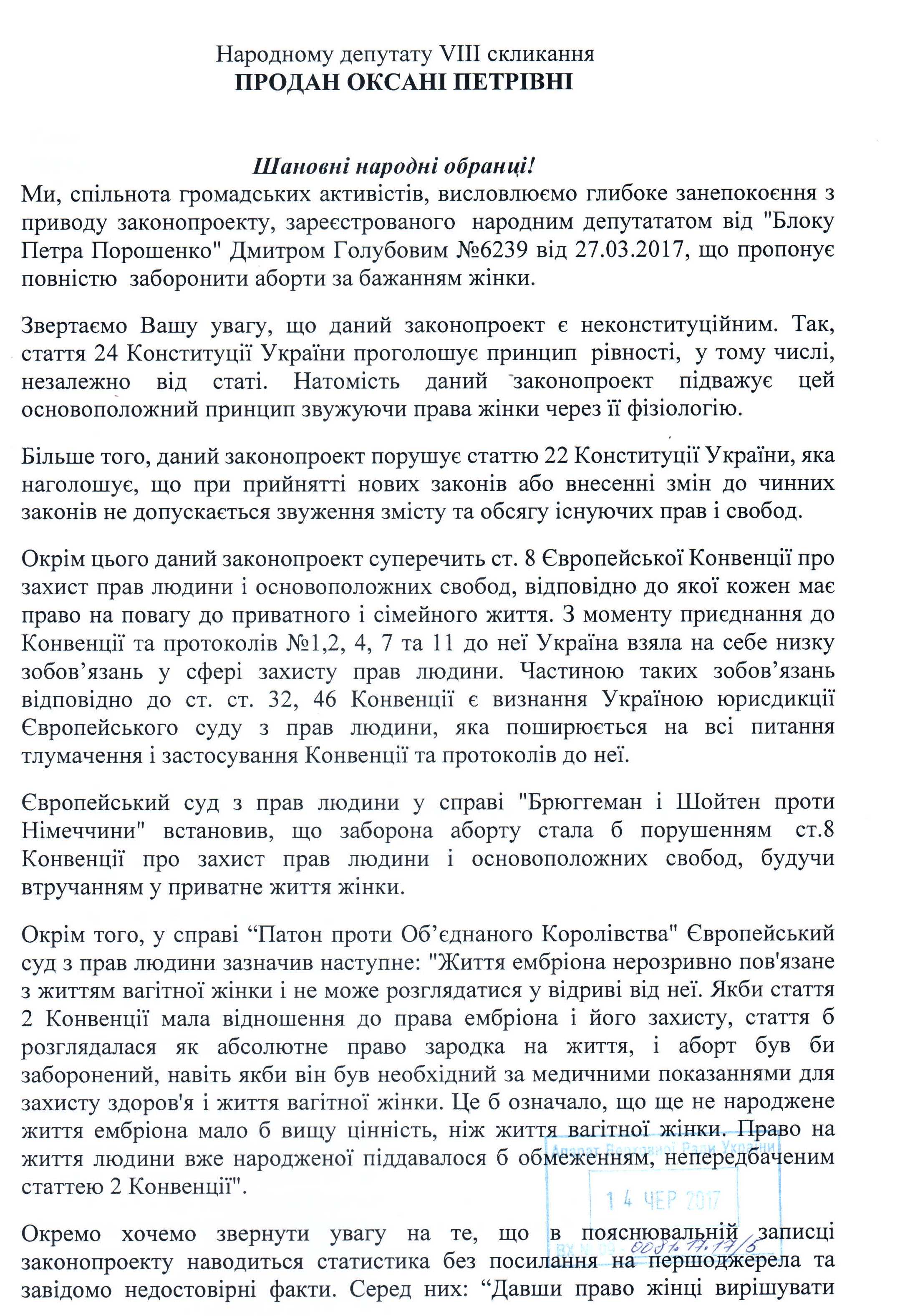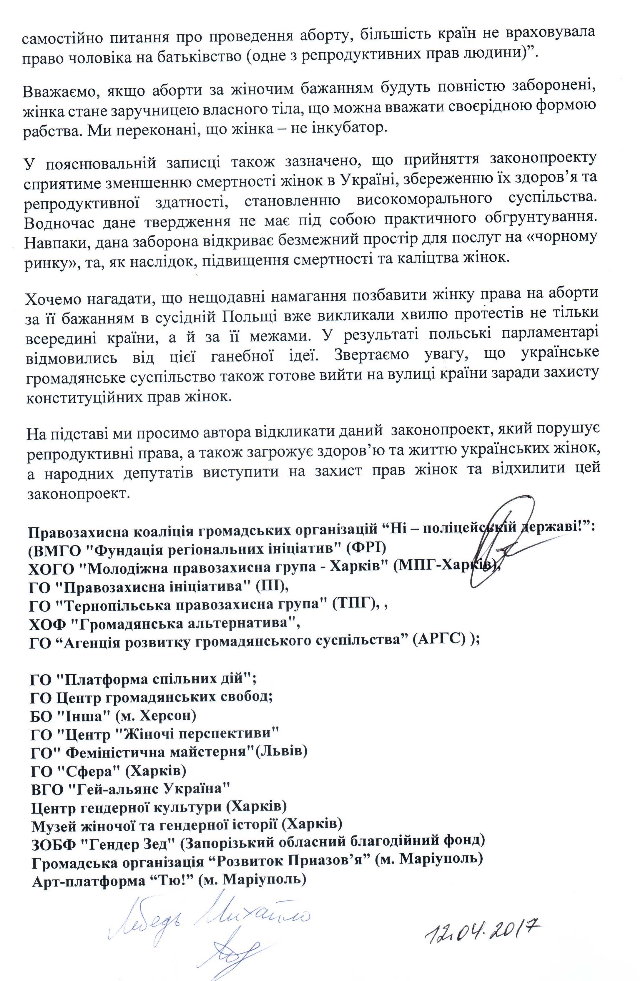 Вхідна документація > Звернення Правозахисної коаліції громадських організацій “Ні – поліцейській державі!” щодо необхідності відхилення законопроекту “Про внесення змін до деяких законодавчих актів України щодо обмежень по проведенню операцій штучного переривання вагітності (абортів)”, реєстр. №6239