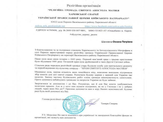 10Тра Коментування вимкнено Звернення Релігійної громади Святого Апостола Матвея Харківської Єпархії УПЦ Київського патріархату щодо надання матеріальної допомоги на побудову церкви