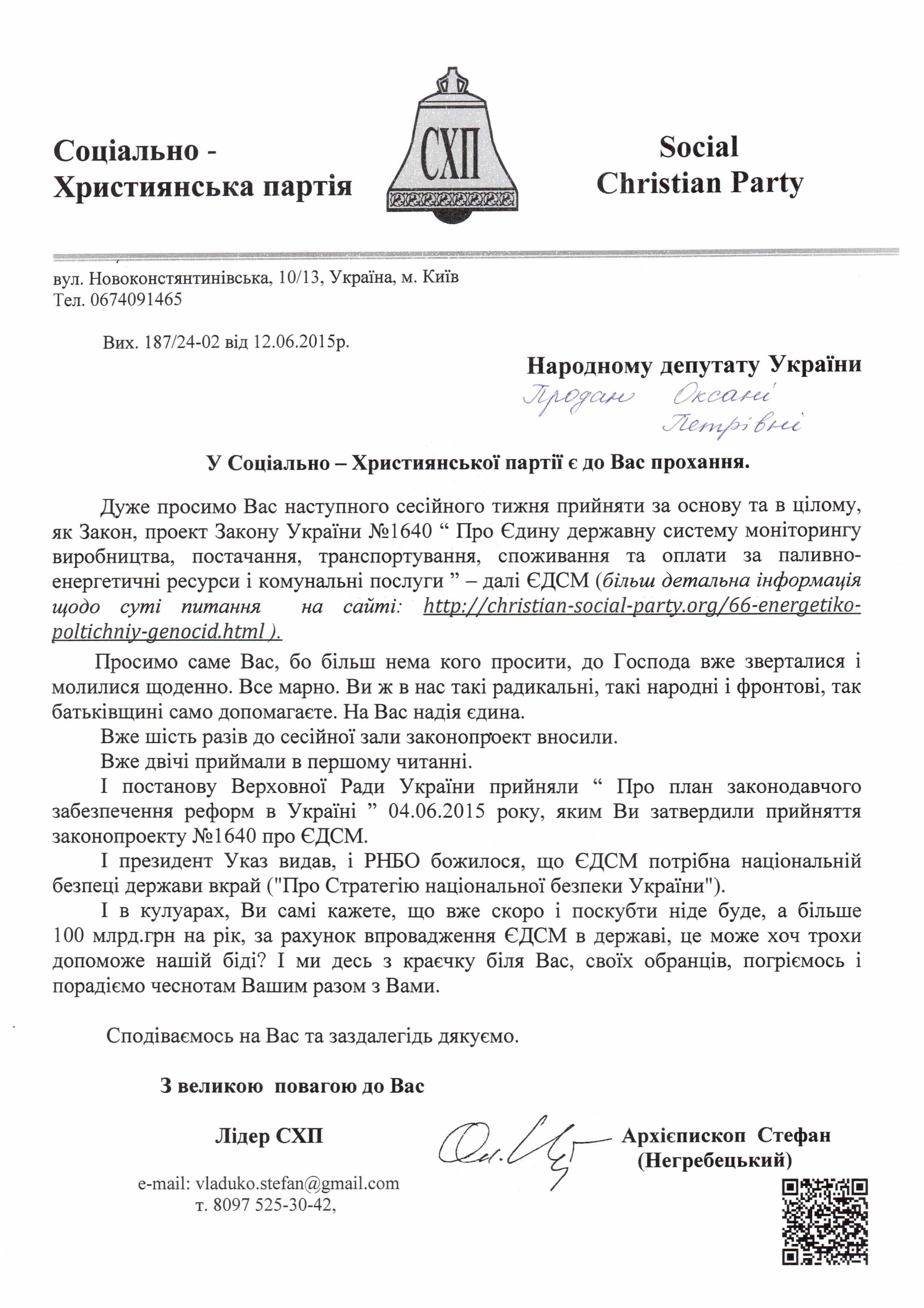 Вхідна документація > Звернення Соціально-Християнської партії щодо підтримки проекту Закону України “Про Єдину державну ситсему моніторингу виробництва, постачання, транспортування, споживання та оплати за паливно-енергетичні ресурси і комунальні послуги”, реєстр. №1640
