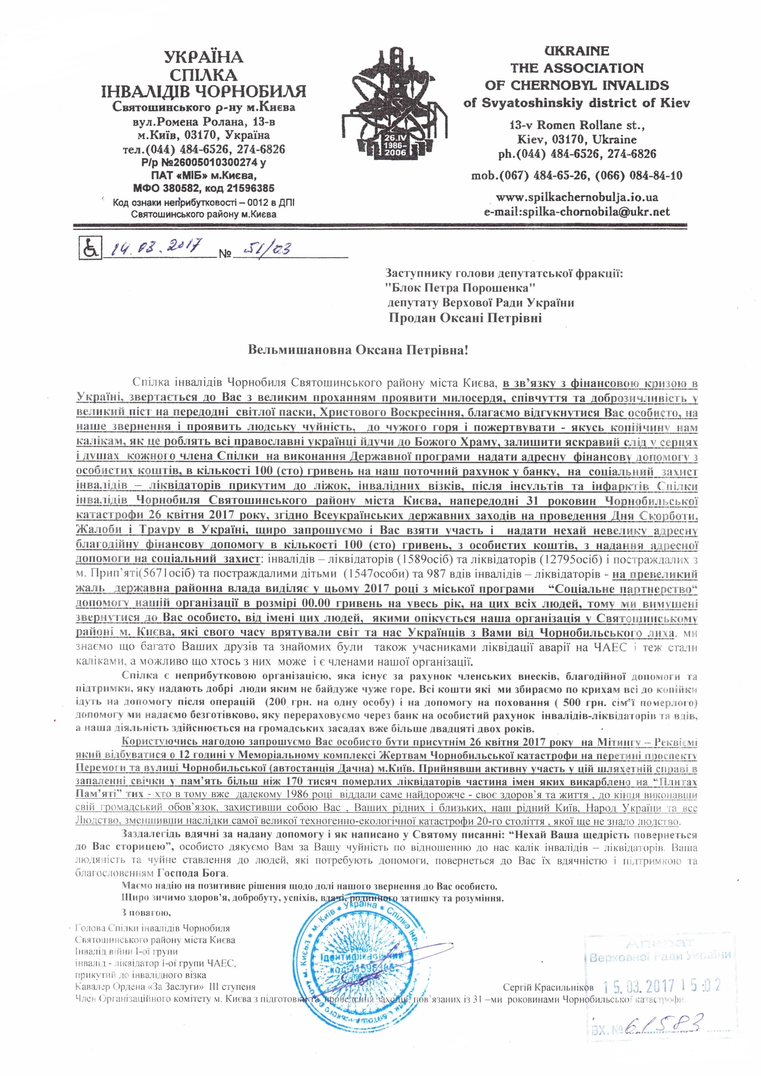 28Бер Коментування вимкнено Звернення Спілки інвалідів Чорнобиля Святошинського району м. Києва щодо надання фінансової допомоги та участі у Мітингу_реквіємі 26 квітня 2017 року