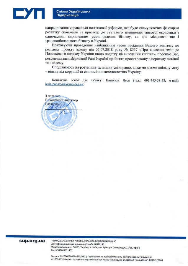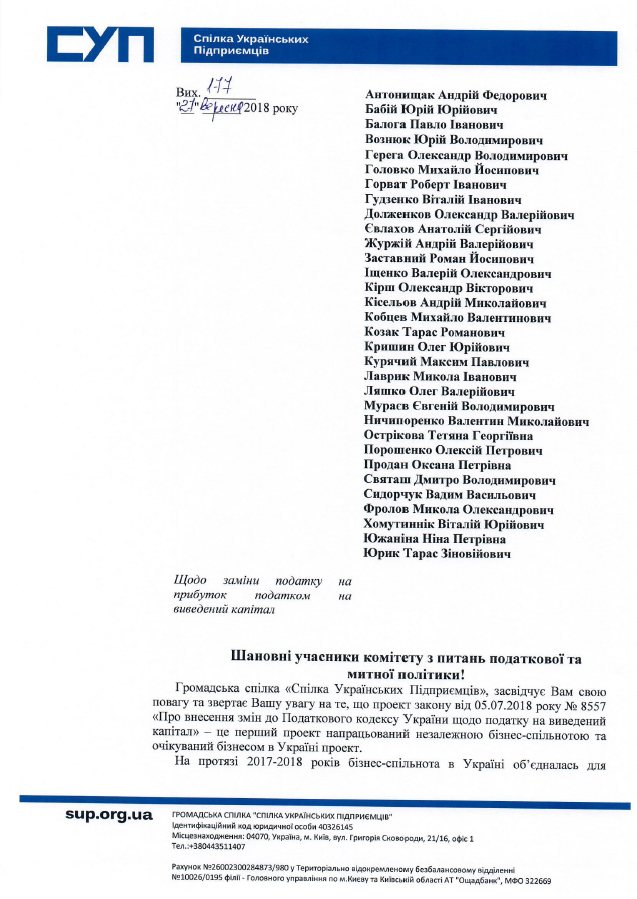 28Вер Коментування вимкнено Звернення Спілки Українських Підприємців щодо заміни податку на прибуток податком на виведений капітал