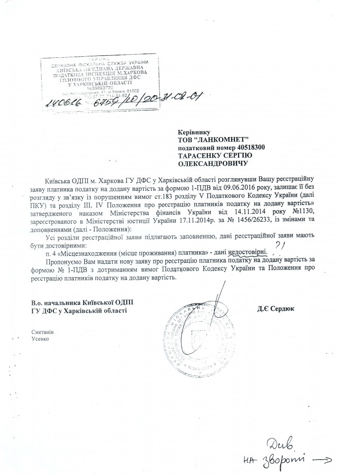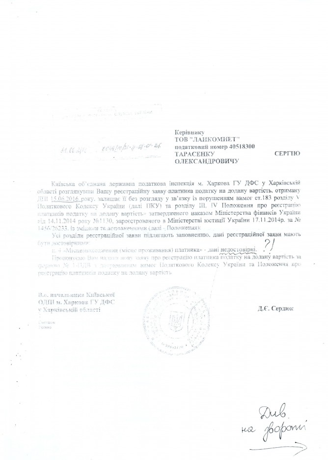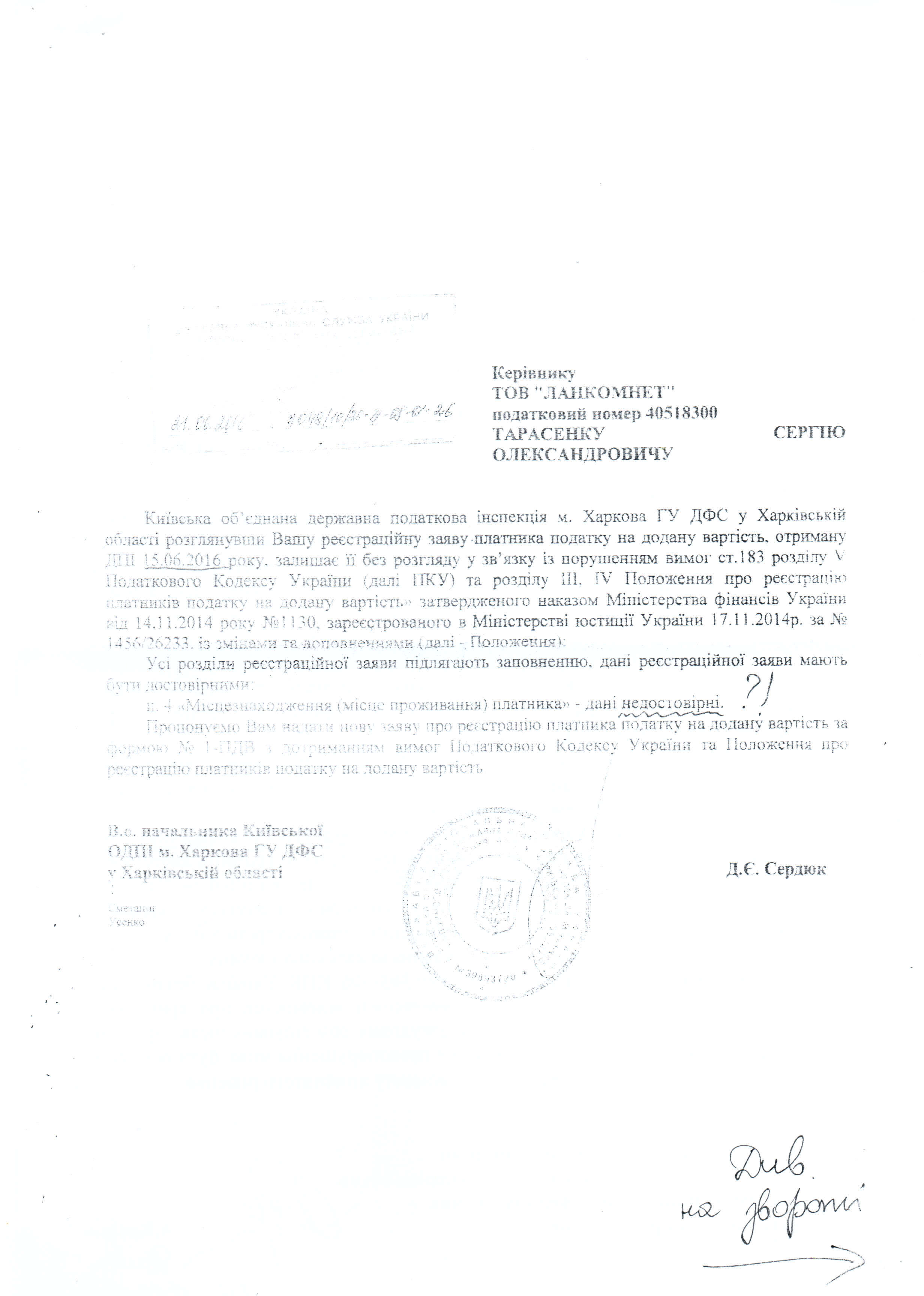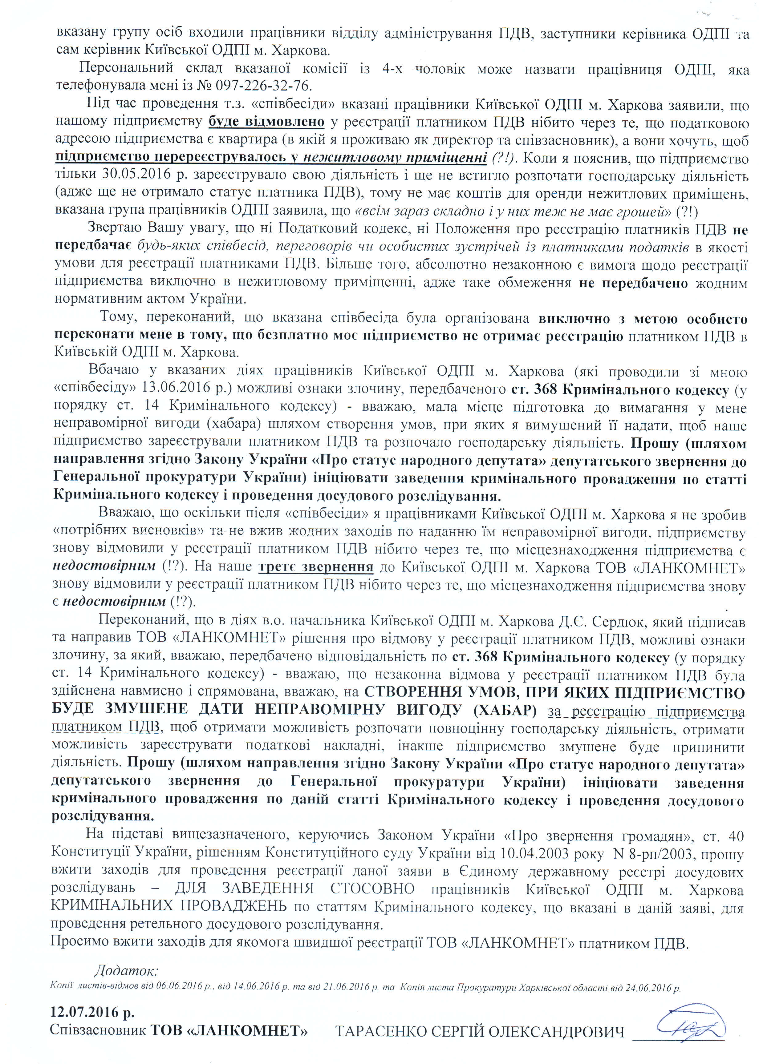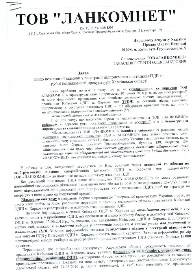 08Вер Коментування вимкнено Звернення співзасновника ТОВ “Ланкомнет” Тарасенка С.О. щодо необгрунтованої відмови співробітників Київської ОДПІ м. Харкова реєструвати товариство платником ПДВ