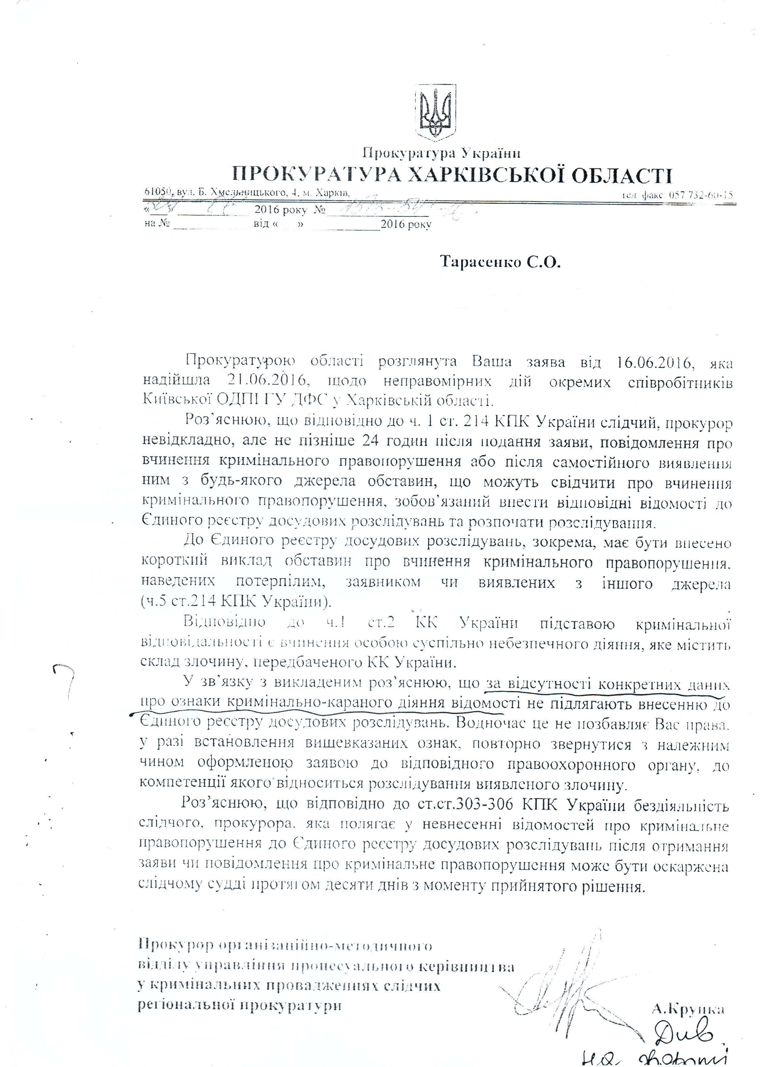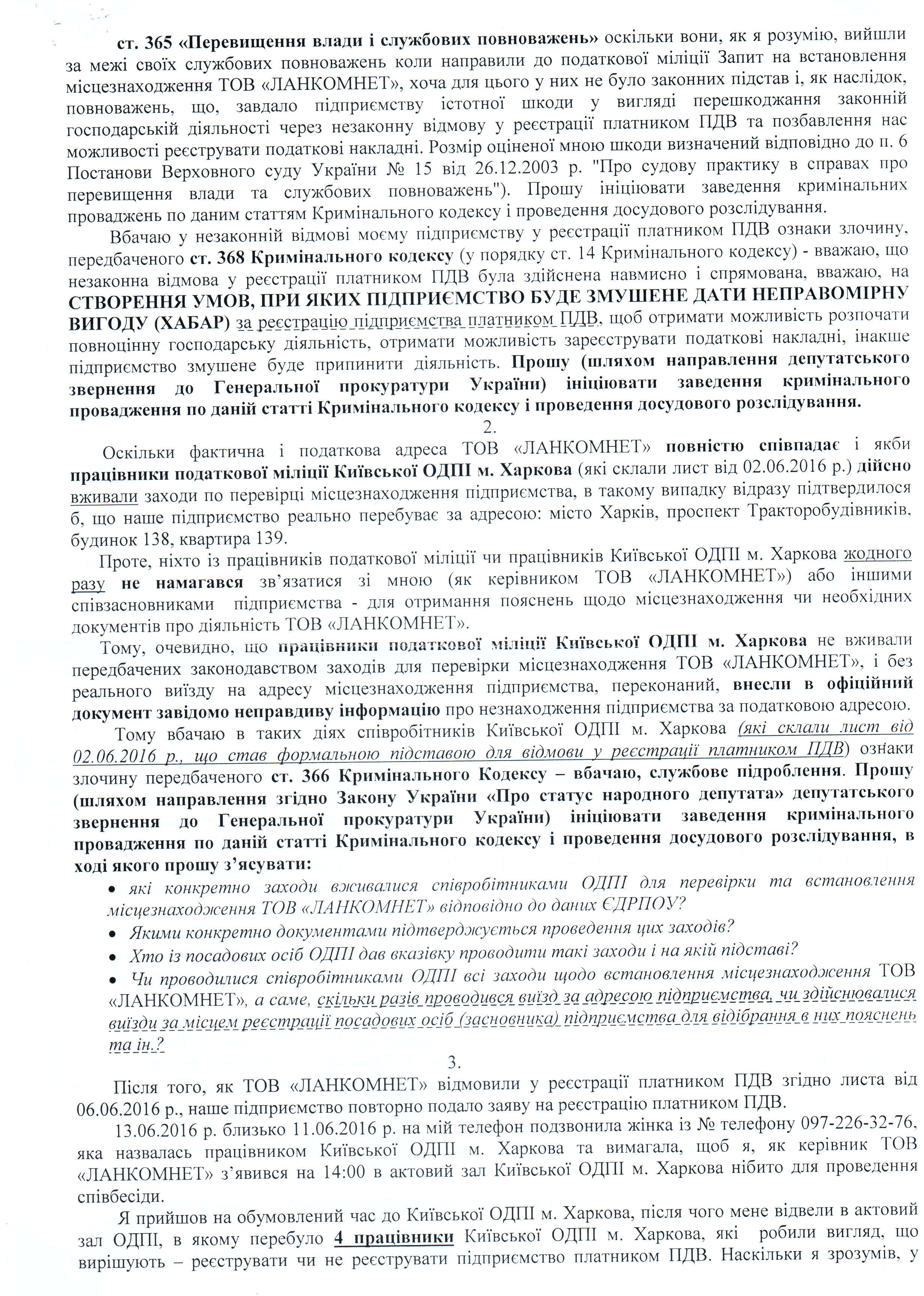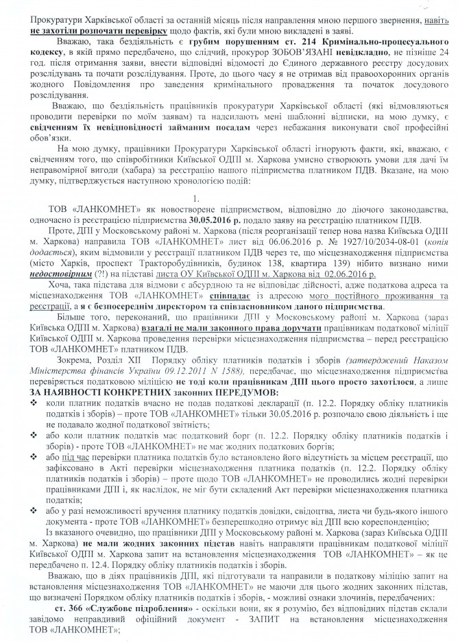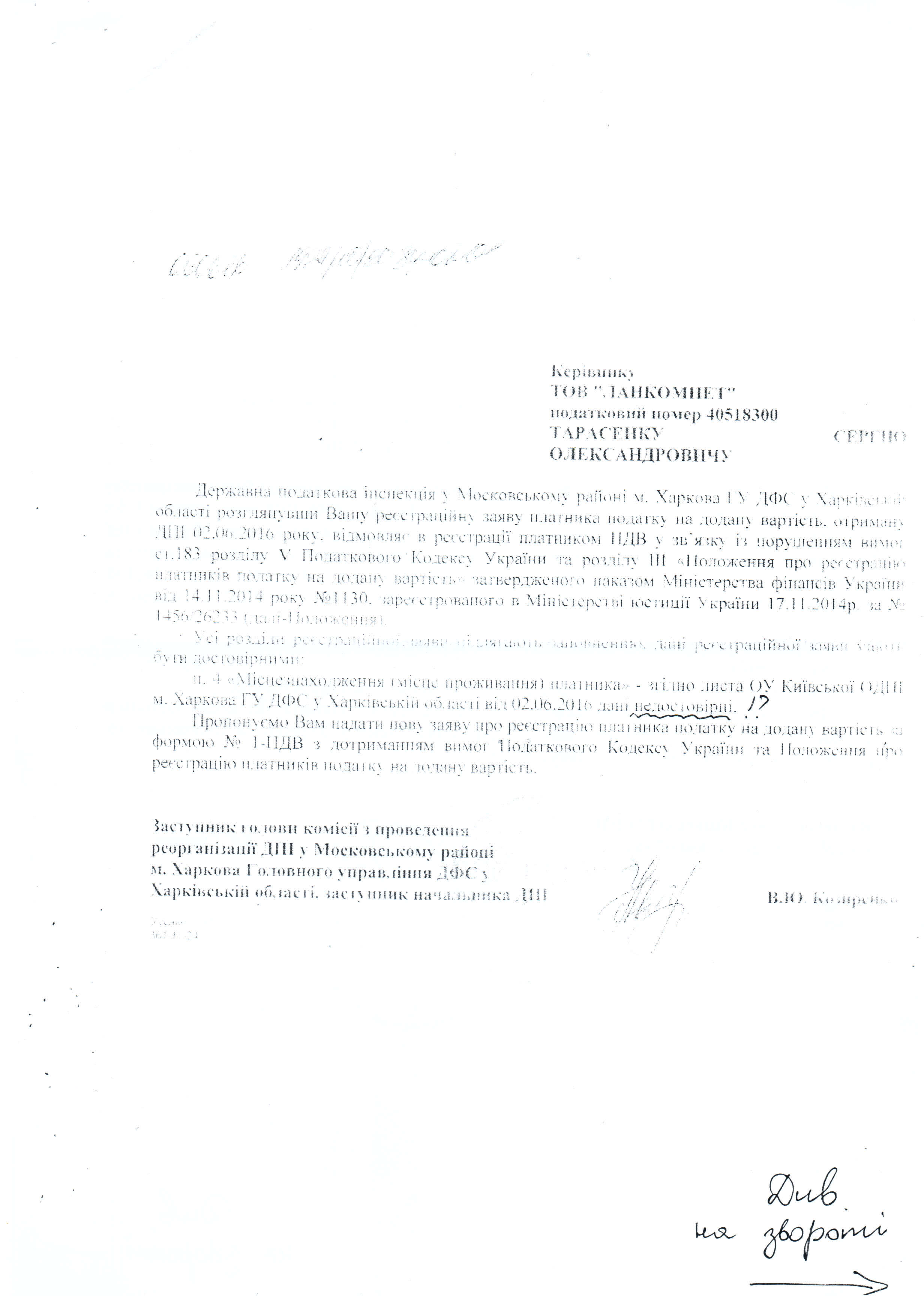 08Вер Коментування вимкнено Звернення співзасновника ТОВ “Ланкомнет” Тарасенка С.О. щодо необгрунтованої відмови співробітників Київської ОДПІ м. Харкова реєструвати товариство платником ПДВ