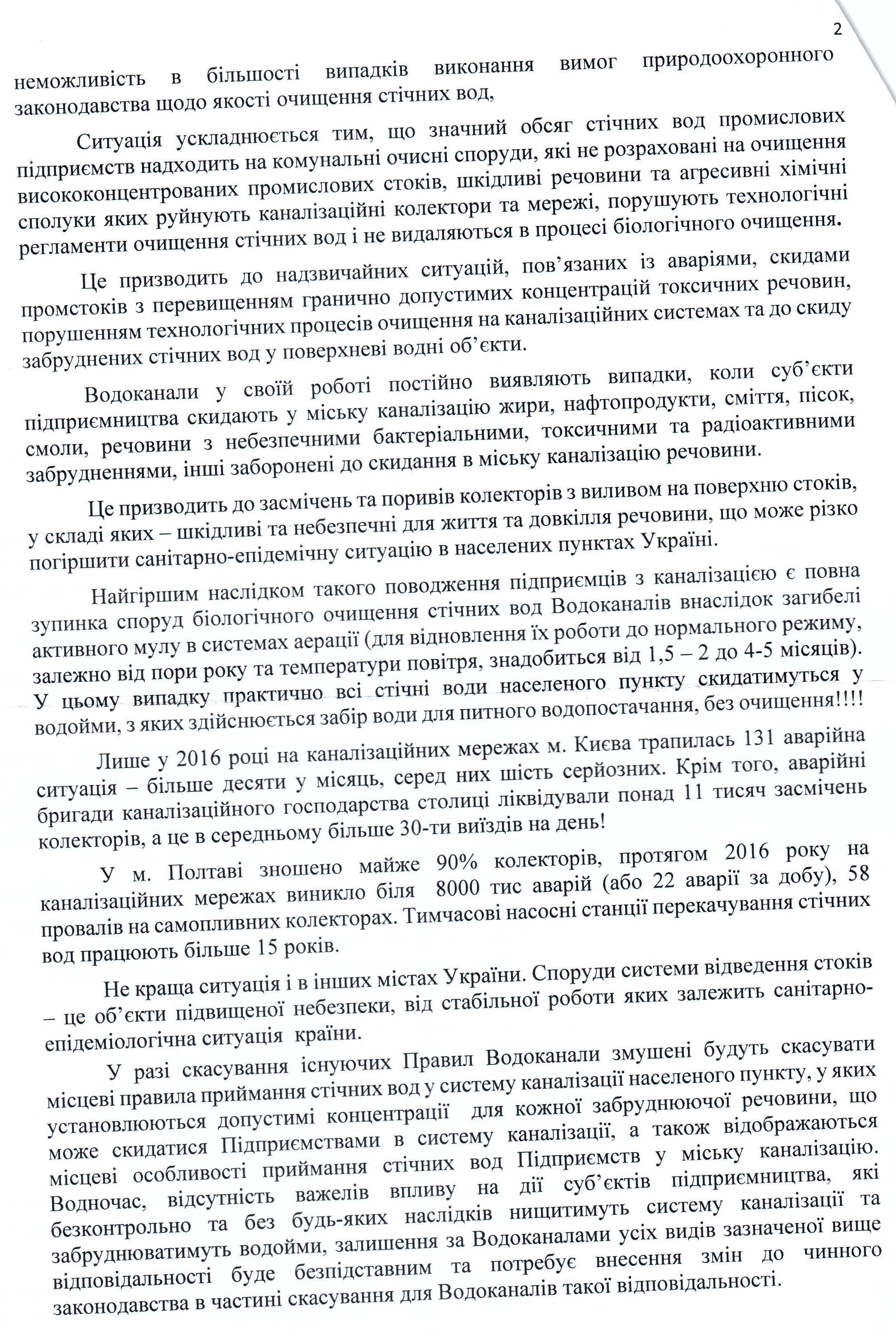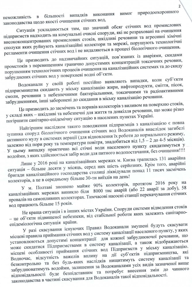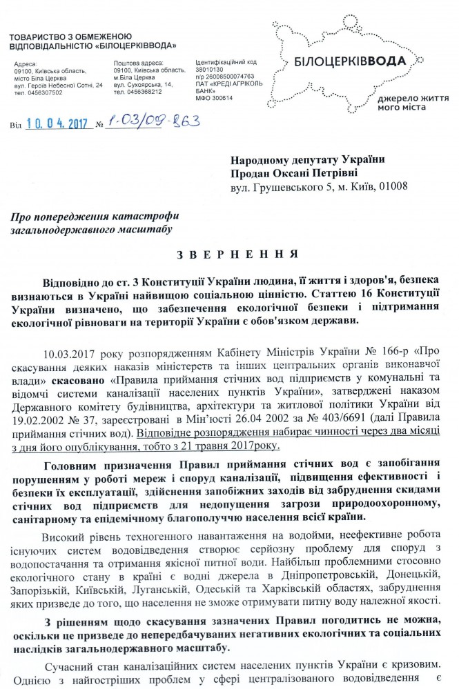 Головна > Верховна Рада України > Вхідна документація > Лист ТОВ “Білоцерківвода” щодо негативних наслідків скасування Правила приймання стічних вод підприємств у комунальні та відомчі системи каналізації населених пунктів України