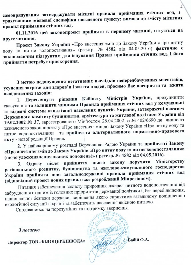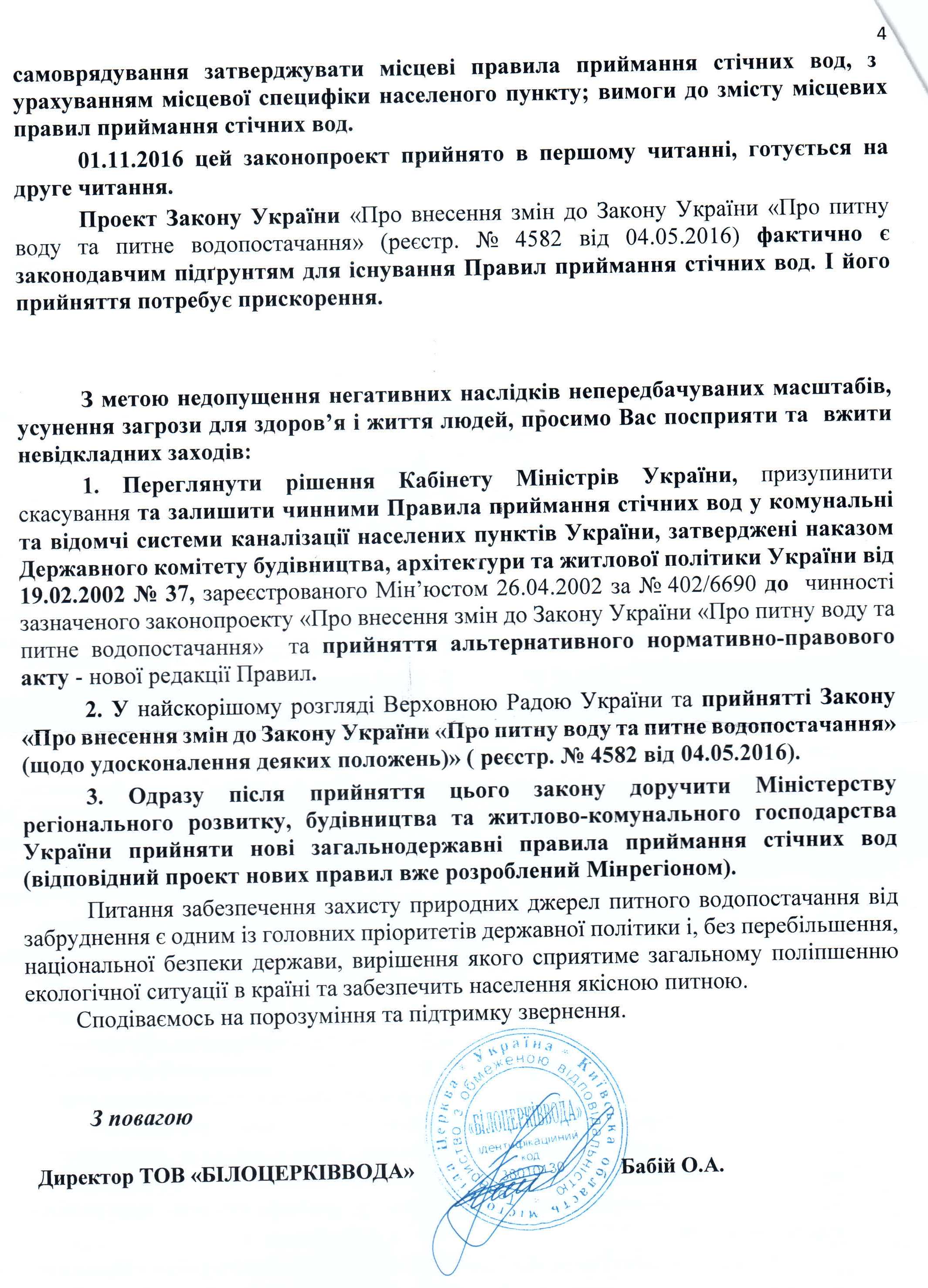 Лист ТОВ “Білоцерківвода” щодо негативних наслідків скасування Правила приймання стічних вод підприємств у комунальні та відомчі системи каналізації населених пунктів України
