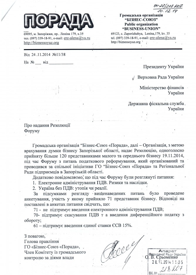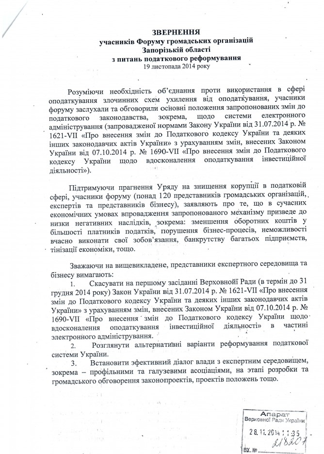 28Січ Коментування вимкнено Звернення учасників Форуму громадських організацій Запорізької області з питань податкового реформування