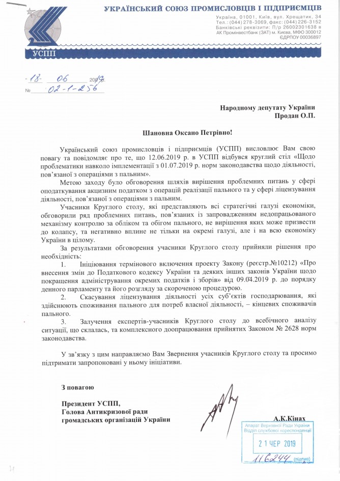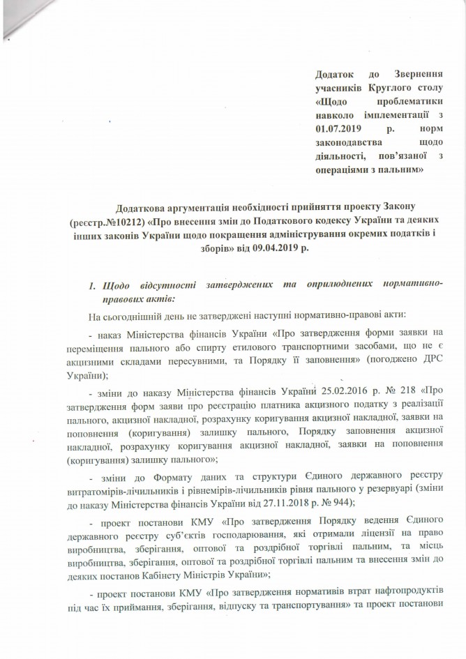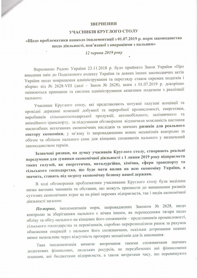 Головна > Верховна Рада України > Вхідна документація > Звернення учасників круглого столу “Щодо проблематики навколо імплементації з 01.07.2019 року норм законодавства щодо діяльності, пов’язаної з операціями з пальним”
