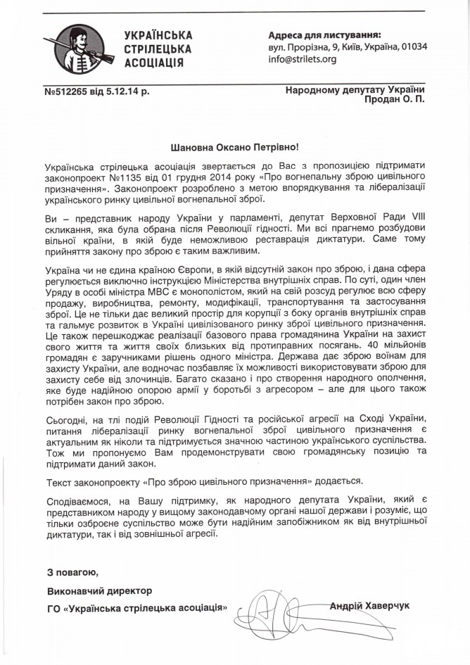 16Січ Коментування вимкнено Звернення Української стрілецької асоціації щодо необхідності підтримки проекту Закону України “Про вогнепальну зброю цивільного призначення”, реєстр. №1135 від 01.12.2014 р.