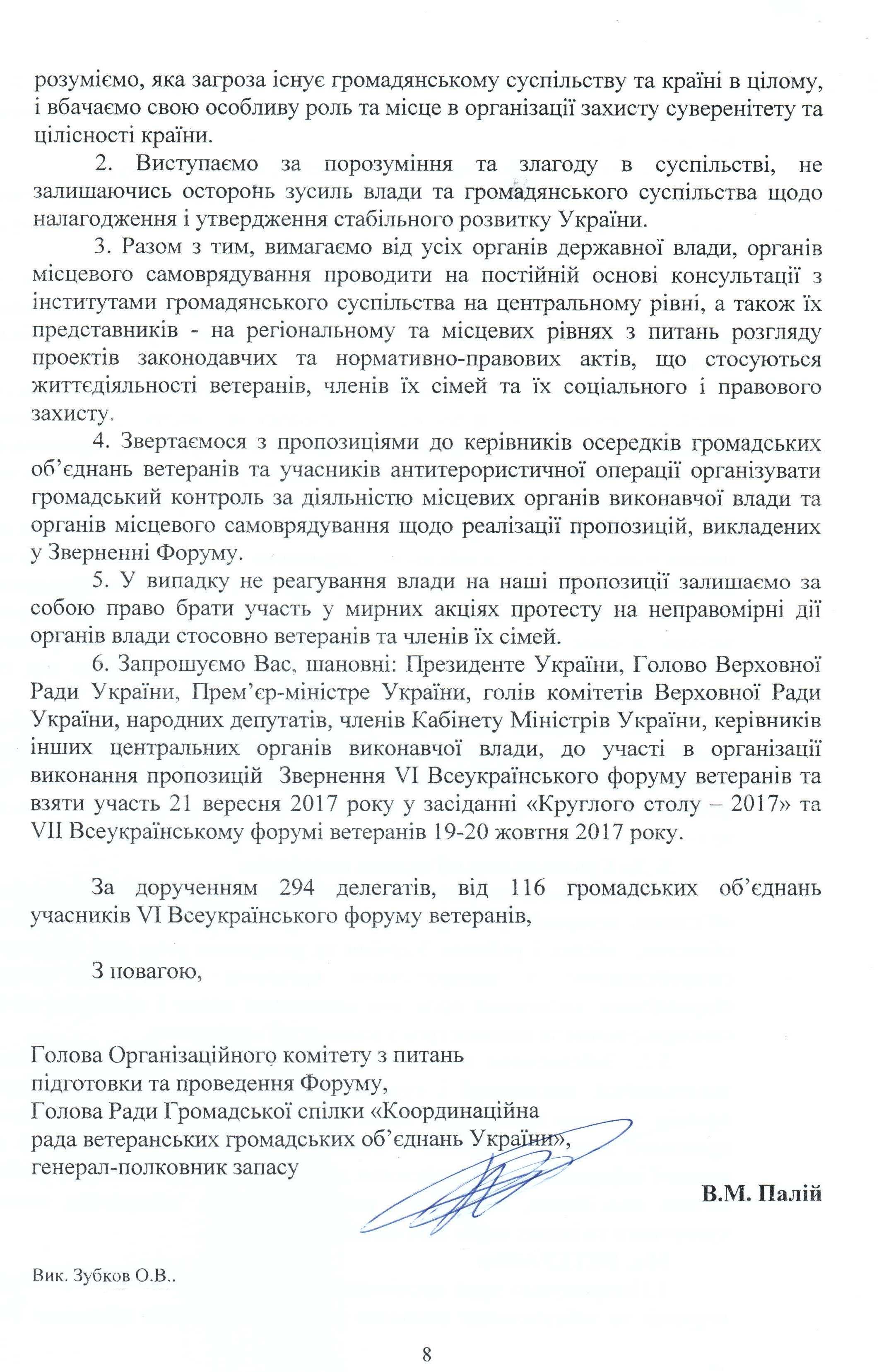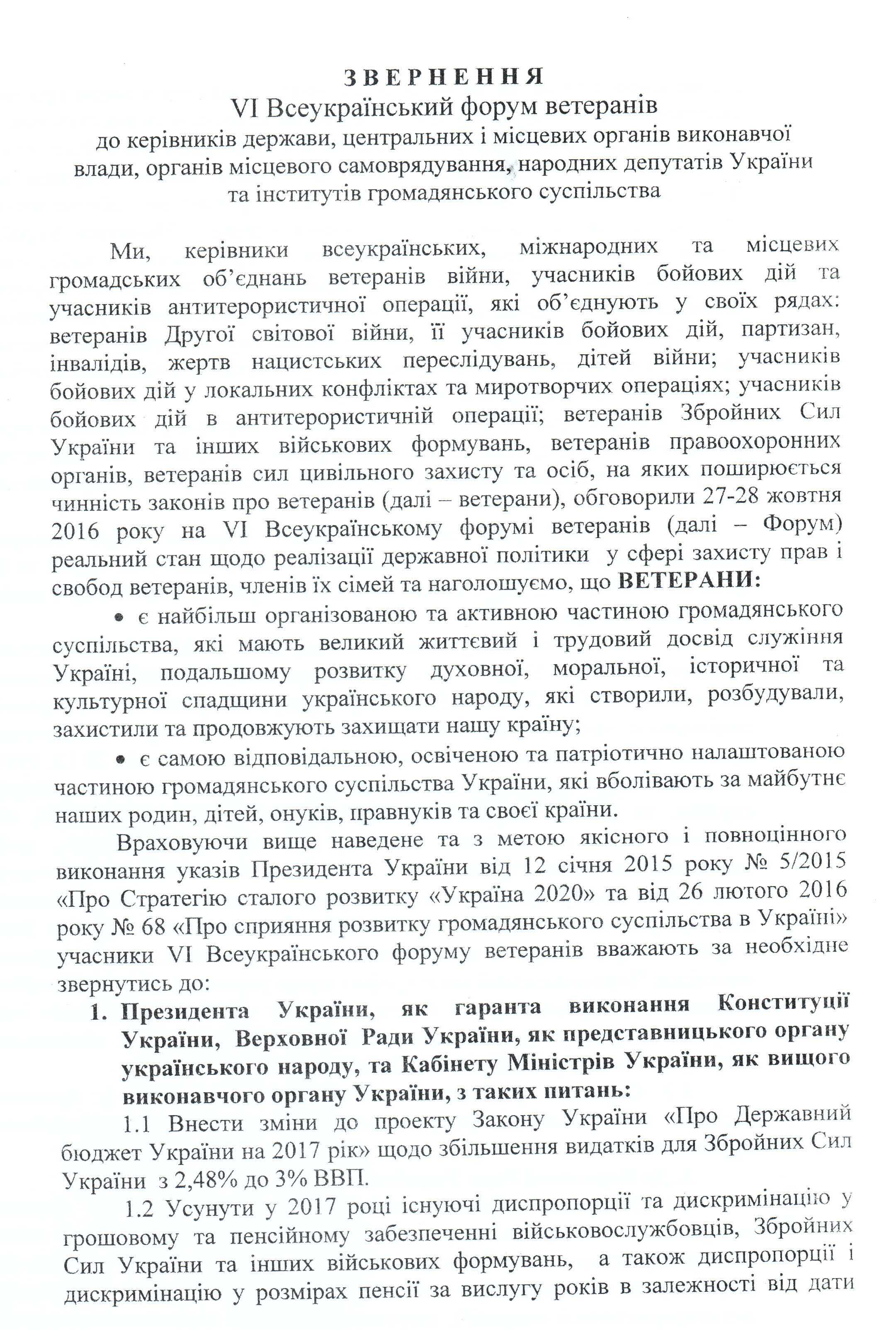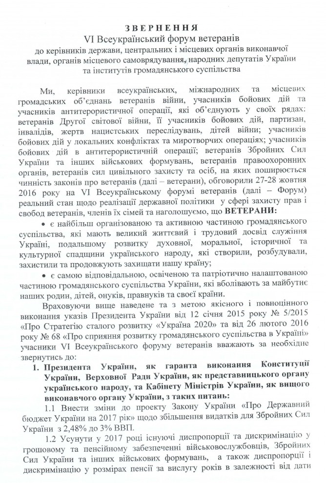 Звернення VI Всеукраїнського форуму ветеранів щодо стану реалізації державної політики у сфері захисту прав і свобод ветеранів та членів їхніх сімей