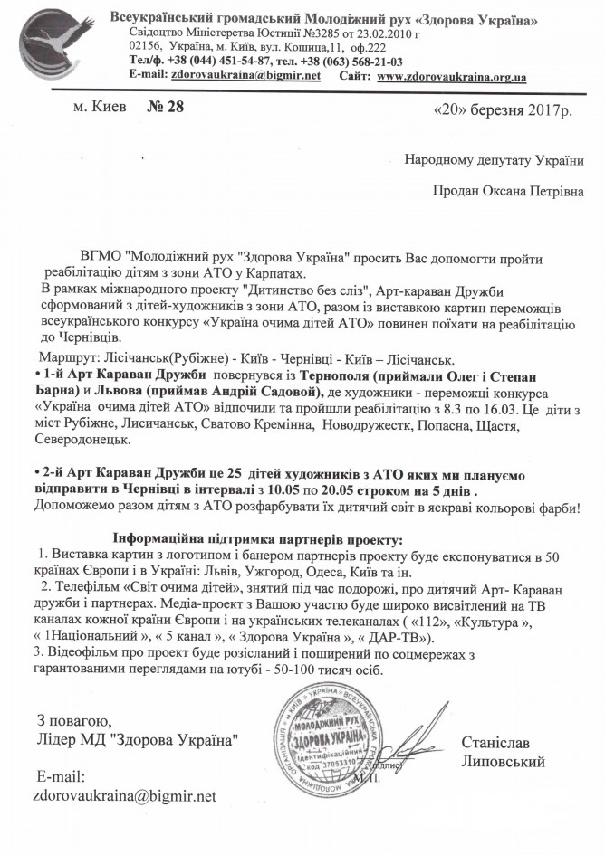 13Кві Коментування вимкнено Звернення Всеукраїнського громадського Молодіжного руху “Здорова Україна” щодо сприяння в реабілітації дітей із зони АТО