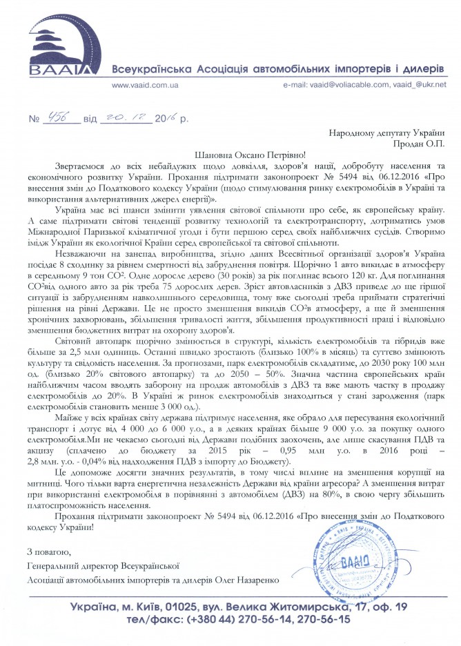 Вхідна документація > Звернення Всеукраїнської Асоціації автомобільних імпортерів і дилерів щодо підтримки законопроекту щодо стимулювання ринку електромобілів в Україні та використання альтернативних джерел енергії, реєстр. №5494