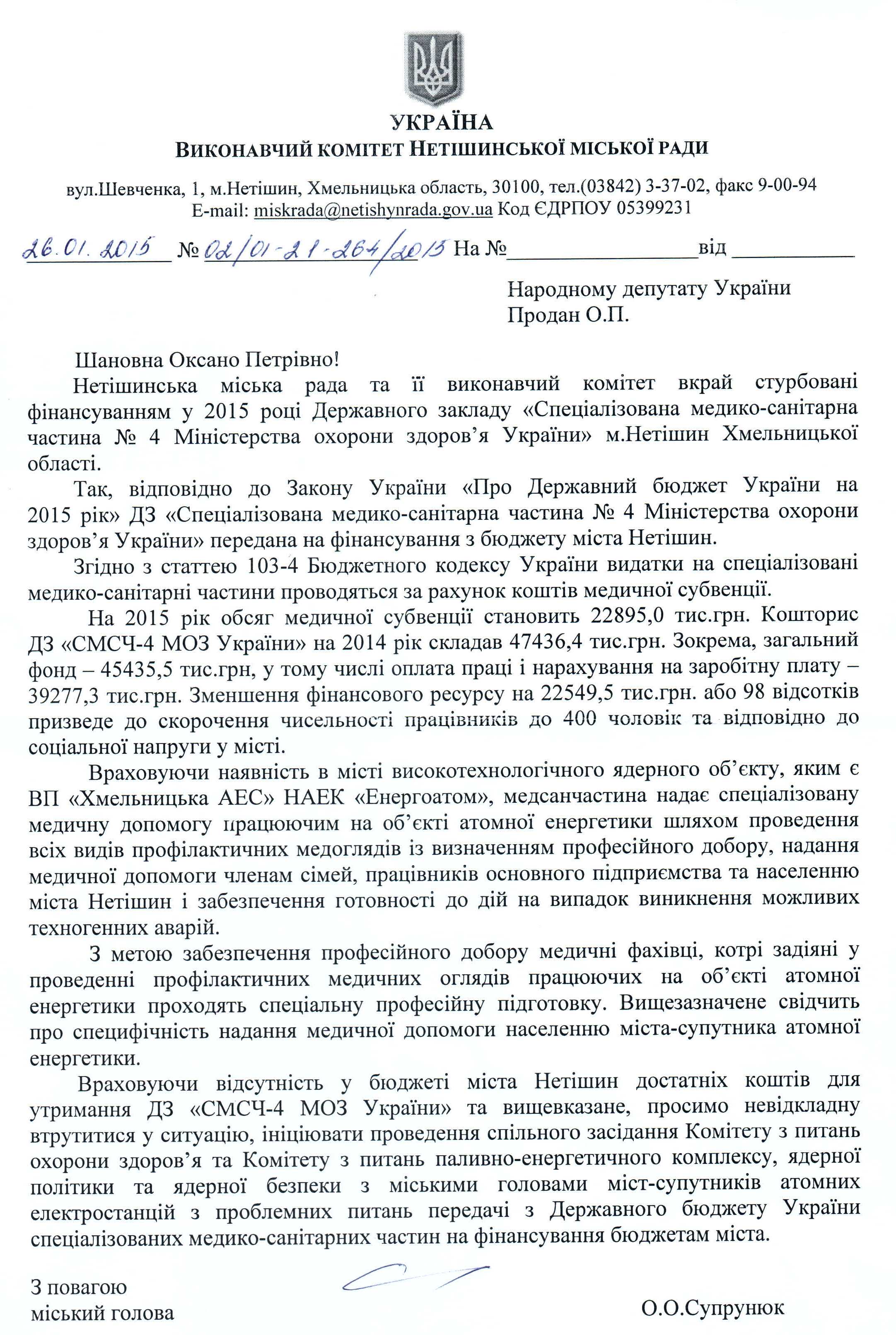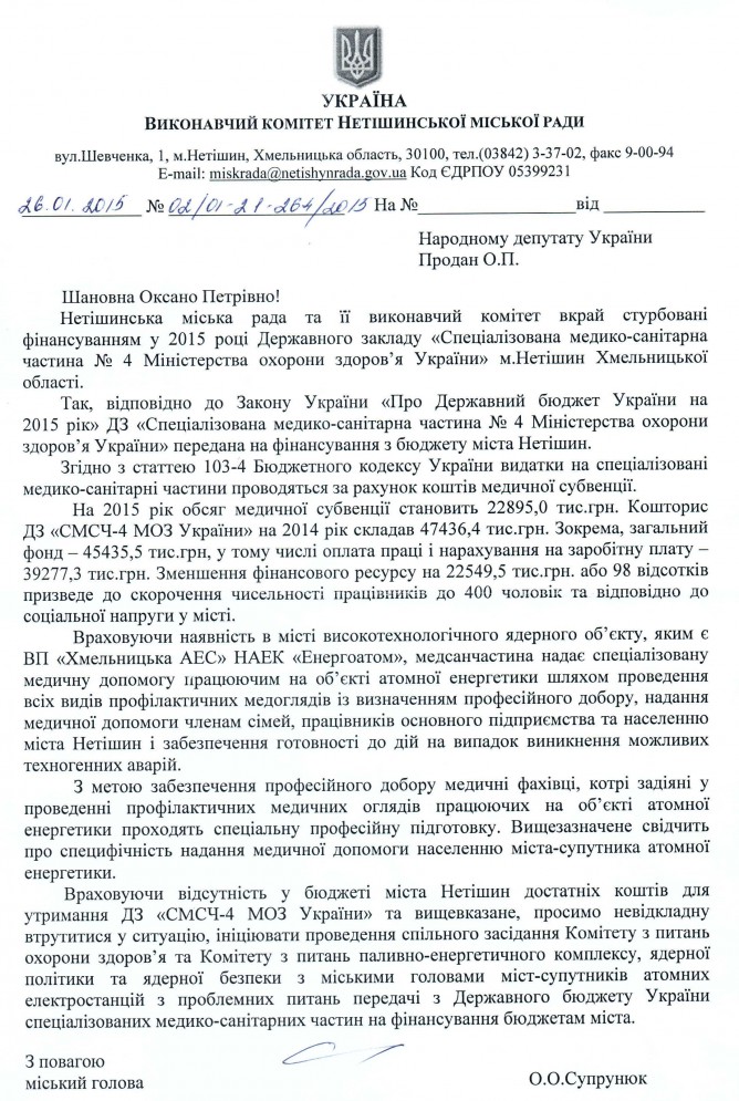 Лист виконавчого комітету Нетішинської міської ради щодо передачі фінансування спеціалізованих медіко-санітарних частин на фіннасування місцевим бюджетам