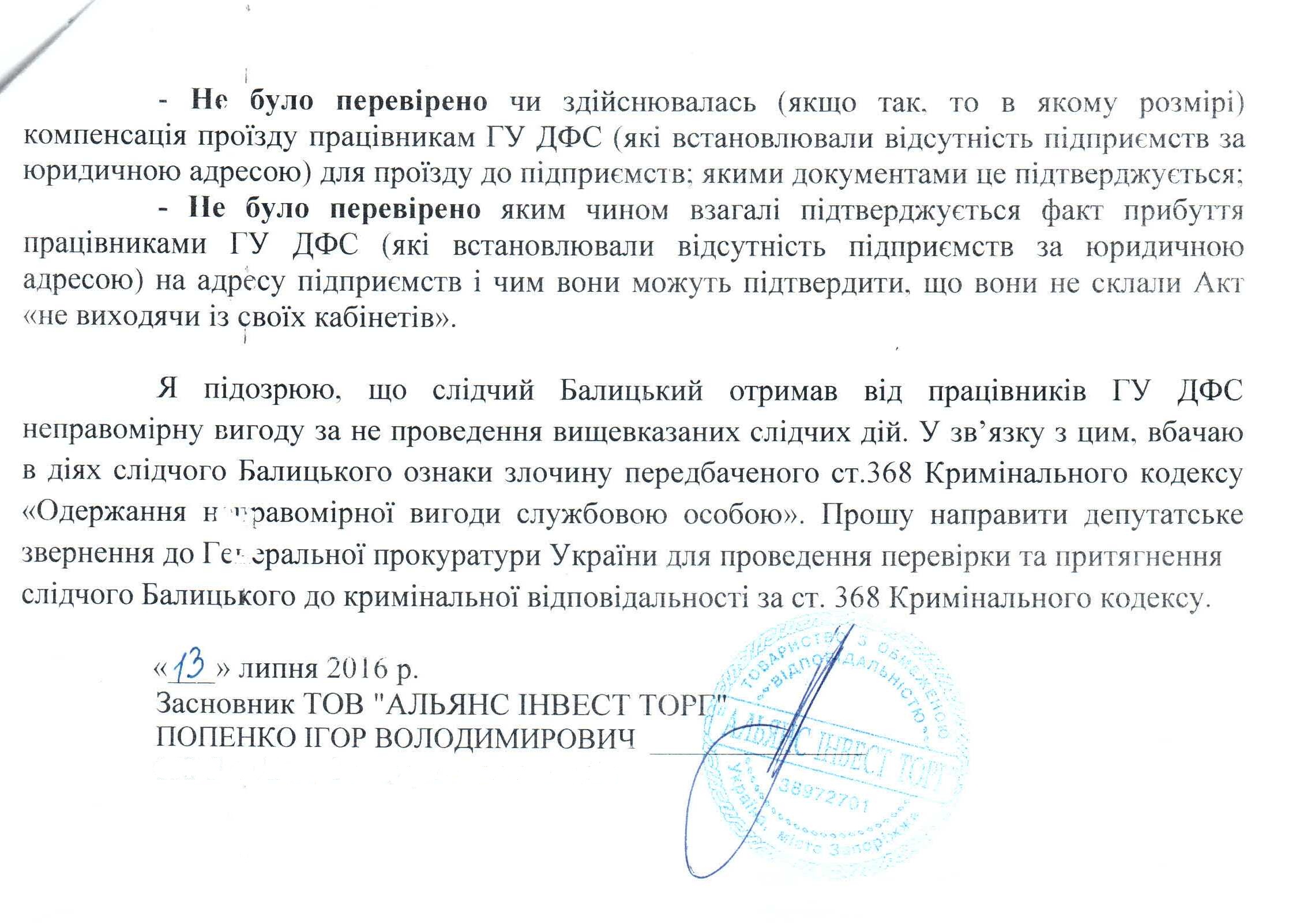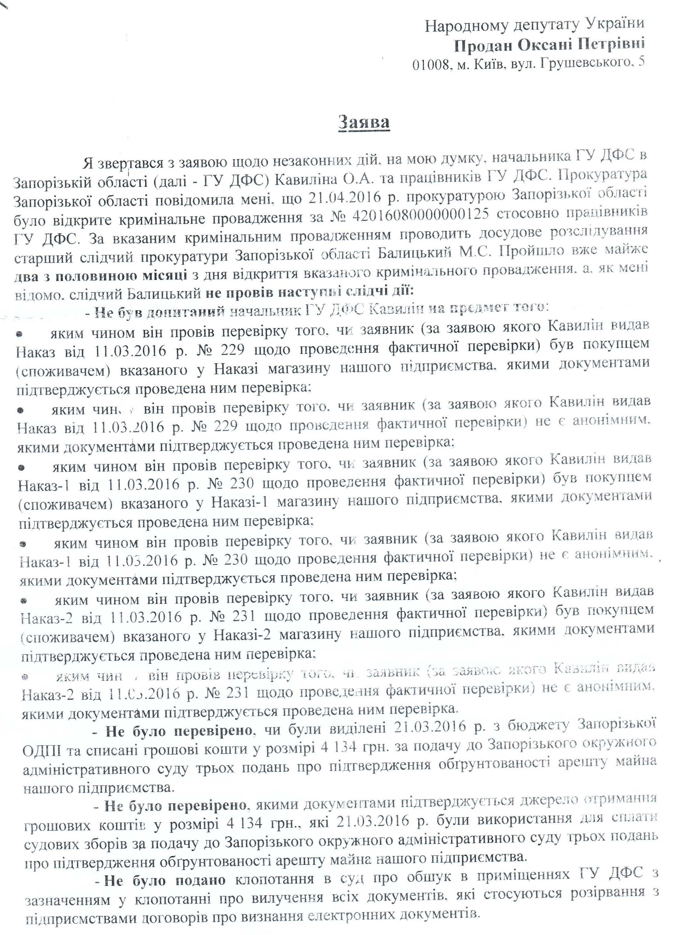 Звернення засновника ТОВ “Альянс Інвест Торг” щодо можливих неправомірних дій співробітників ГУ ДФС у Запорізькій області та бездіяльності прокуратури Запорізької області