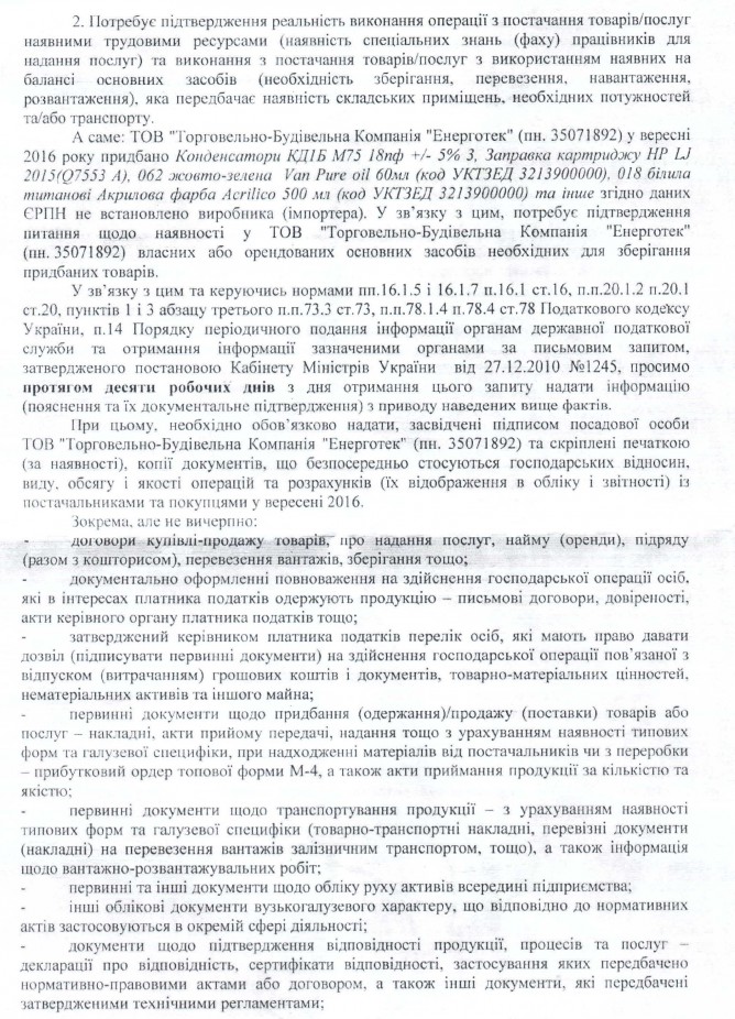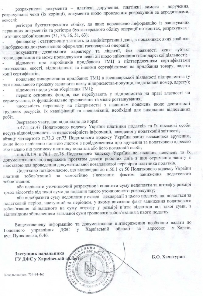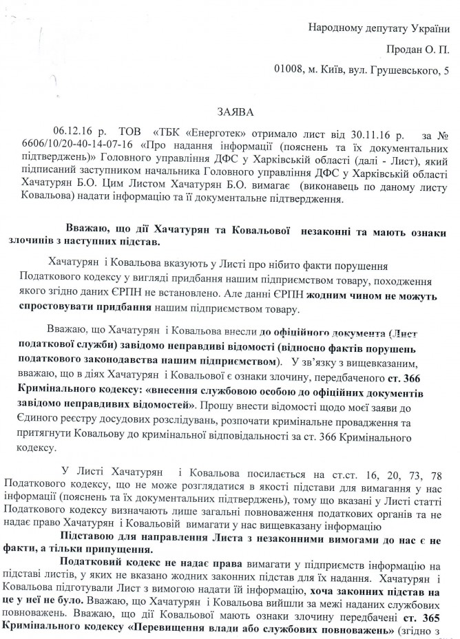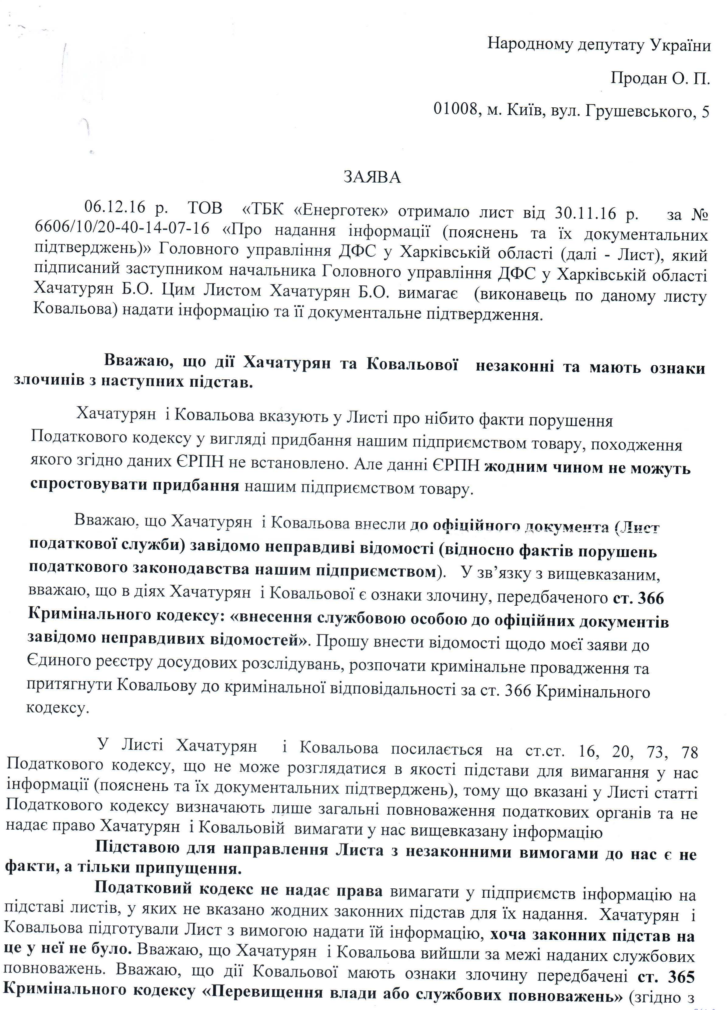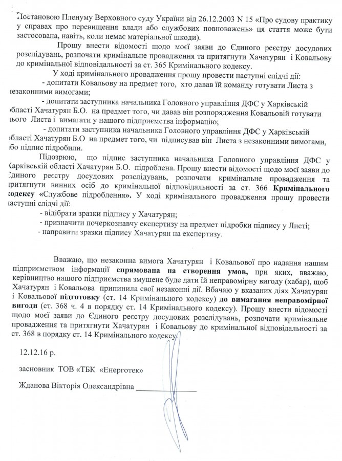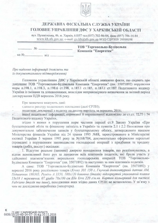 11Січ Коментування вимкнено Звернення засновника ТОВ “ТБК “Енерготек” Жданової В.О. щодо незаконності вимог ГУ ДФС у Харківській області та внесення до офіційних документів завідомо неправдивих відомостей ВІДПОВІДЬ ЗАЯВНИКУ