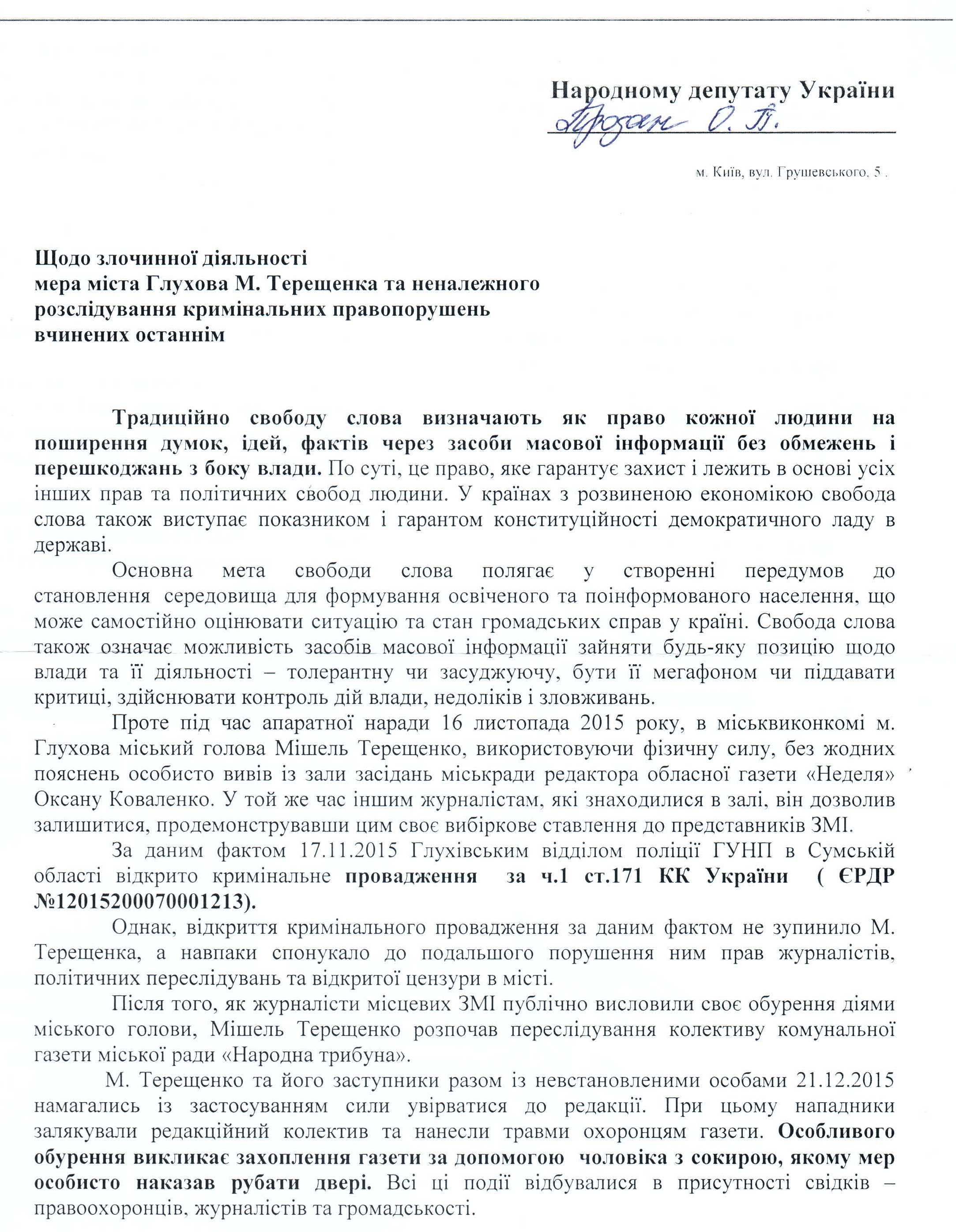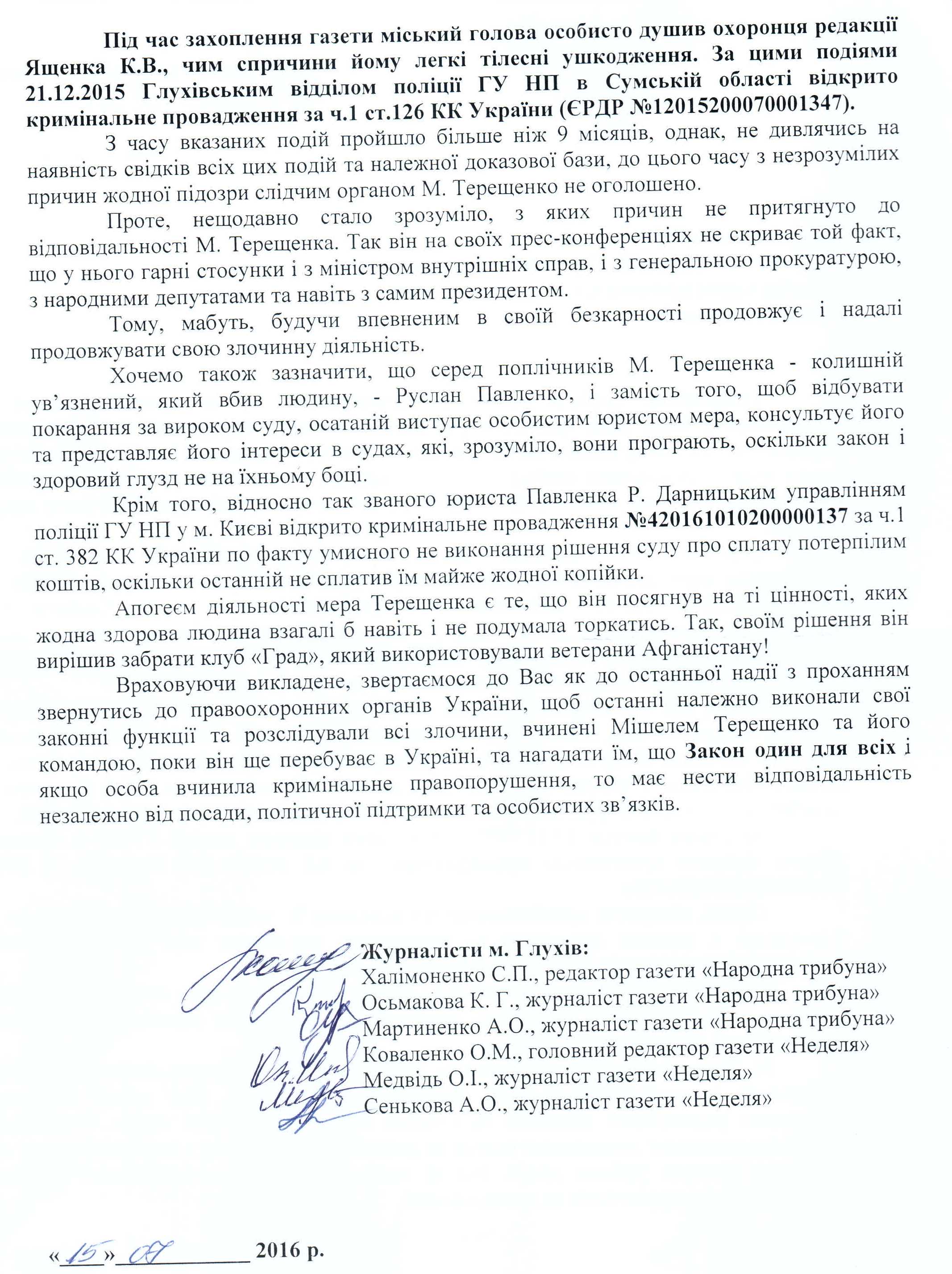 22Сер Коментування вимкнено Звернення журналістів м. Глухів щодо перешкоджання їхній журналістській діяльності та зловживань мера м. Глухів М. Терещенка